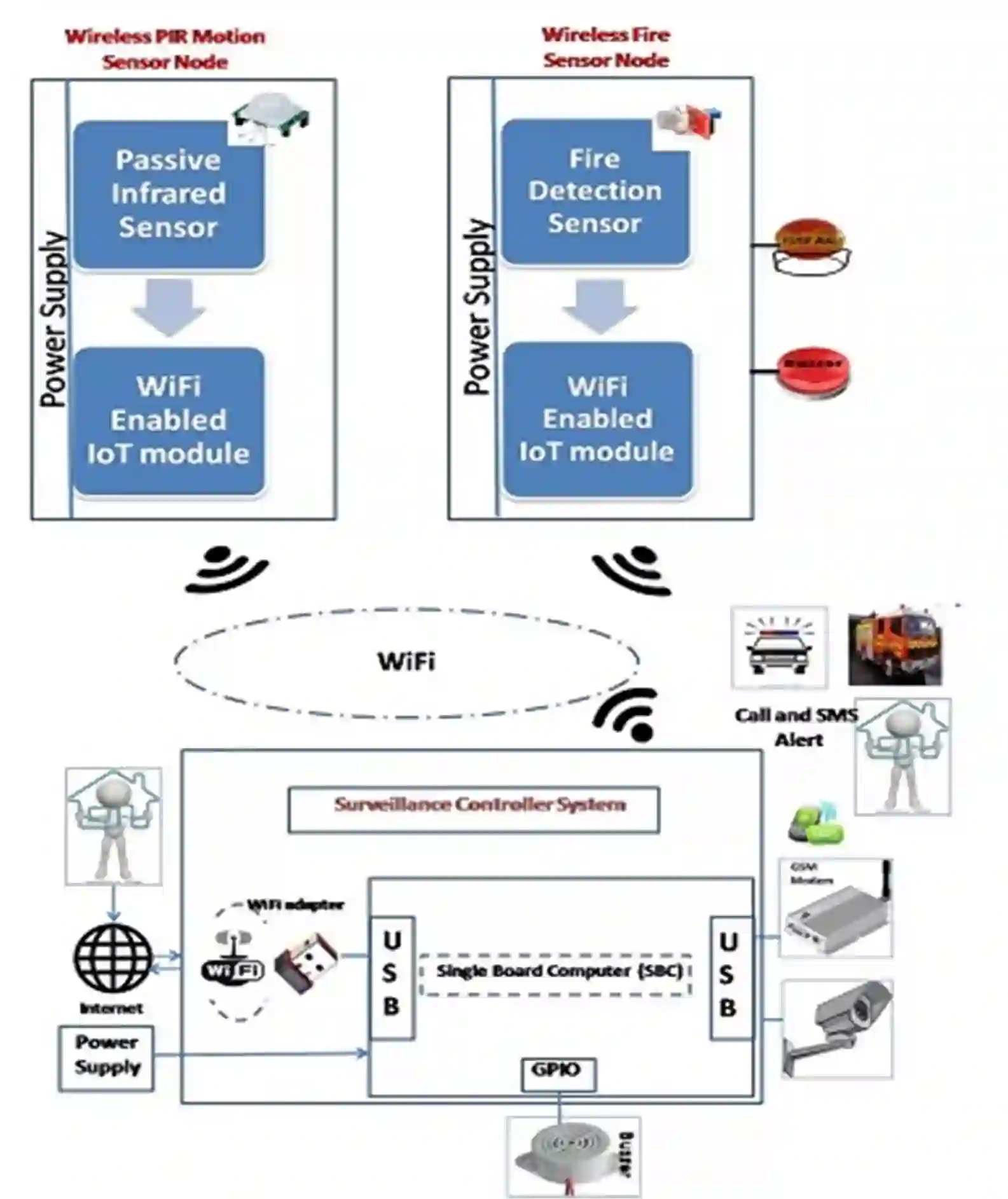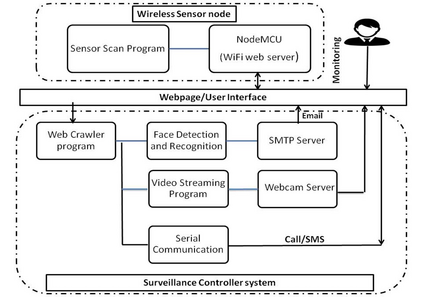 翻译:互联网(IoT)的出现具有使人类生活自动化的动机,可以视像为能够提供智能服务的连接物网络,本文展示了使用Raspberry Pi 单机计算机(SBC)和NodeMCU(WiFi/IoT模块)的建筑物内基于IoT的安全监视系统,该系统由无线传感器节点和监控控制器组成,通过面部探测和识别、火灾探测、远程用户警报、现场视频流和可移动性等入侵探测系统是该系统的主要特征。在入侵探测中使用面部识别特征,通过识别受限制地区已知和未知的人,使系统更有效率。WiFi模块处理基于传感器的事件并将传感器状态发送给控制器部分。收到事件通知后,控制器使摄像机能够捕捉事件,通过电子邮件、电话和短信息服务提醒用户,并将事件现场视频放在网页上。WiFi模块的使用使节点紧凑,成本高,便于使用。系统的最大优势是用户可以从世界各地寻求监视。
