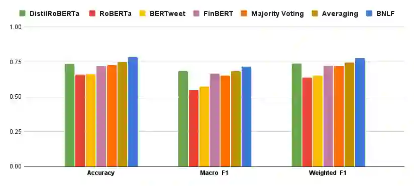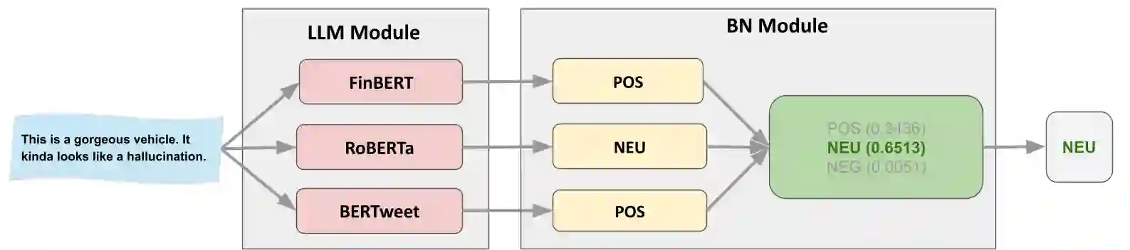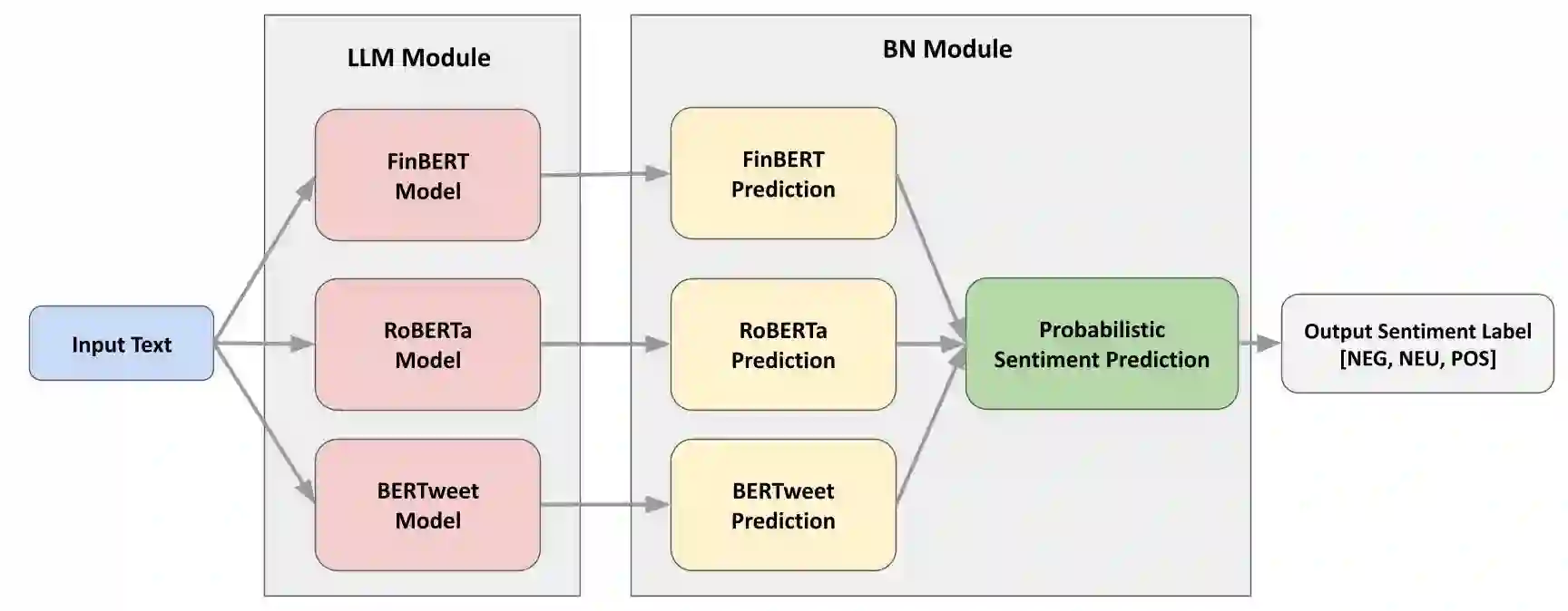 翻译:大语言模型(LLMs)持续发展,针对特定任务的领域专用变体日益增多。然而,这些模型通常缺乏透明度和可解释性,微调成本高昂,需要大量提示工程,在不同领域的结果不一致,且因其高计算需求对环境造成显著负面影响。为应对这些挑战,我们提出了贝叶斯网络LLM融合(BNLF)框架,该框架通过概率机制整合了FinBERT、RoBERTa和BERTweet三种LLM的预测结果,用于情感分析。BNLF通过将多个LLM的情感预测建模为贝叶斯网络中的概率节点,实现后期融合。在三个具有不同语言和上下文特征的人工标注金融语料库上进行评估,BNLF相比基线LLM在准确率上持续提升约6%,突显了其对数据集变异性的鲁棒性以及概率融合在可解释情感分类中的有效性。