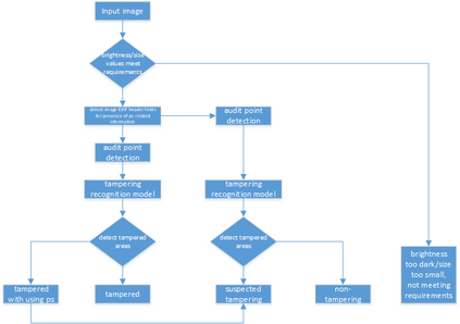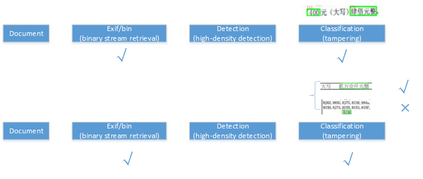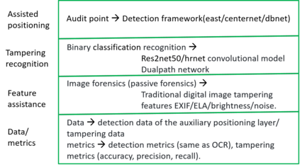 Document tamper detection has always been an important aspect of tamper detection. Before the advent of deep learning, document tamper detection was difficult. We have made some explorations in the field of text tamper detection based on deep learning. Our Ps tamper detection method includes three steps: feature assistance, audit point positioning, and tamper recognition. It involves hierarchical filtering and graded output (tampered/suspected tampered/untampered). By combining artificial tamper data features, we simulate and augment data samples in various scenarios (cropping with noise addition/replacement, single character/space replacement, smearing/splicing, brightness/contrast adjustment, etc.). The auxiliary features include exif/binary stream keyword retrieval/noise, which are used for branch detection based on the results. Audit point positioning uses detection frameworks and controls thresholds for high and low density detection. Tamper recognition employs a dual-path dual-stream recognition network, with RGB and ELA stream feature extraction. After dimensionality reduction through self-correlation percentile pooling, the fused output is processed through vlad, yielding an accuracy of 0.804, recall of 0.659, and precision of 0.913.