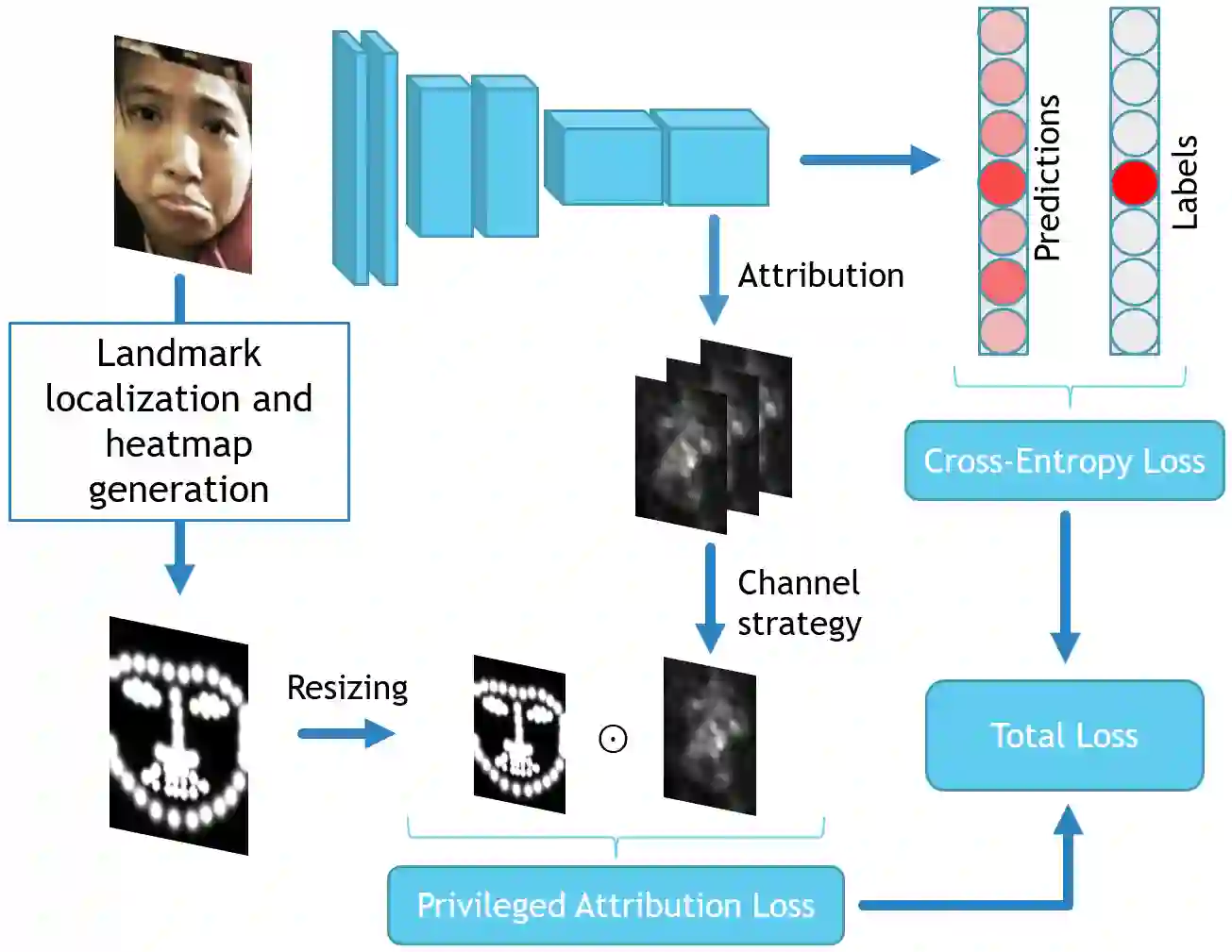 Facial Expression Recognition (FER) is crucial in many research domains because it enables machines to better understand human behaviours. FER methods face the problems of relatively small datasets and noisy data that don't allow classical networks to generalize well. To alleviate these issues, we guide the model to concentrate on specific facial areas like the eyes, the mouth or the eyebrows, which we argue are decisive to recognise facial expressions. We propose the Privileged Attribution Loss (PAL), a method that directs the attention of the model towards the most salient facial regions by encouraging its attribution maps to correspond to a heatmap formed by facial landmarks. Furthermore, we introduce several channel strategies that allow the model to have more degrees of freedom. The proposed method is independent of the backbone architecture and doesn't need additional semantic information at test time. Finally, experimental results show that the proposed PAL method outperforms current state-of-the-art methods on both RAF-DB and AffectNet.