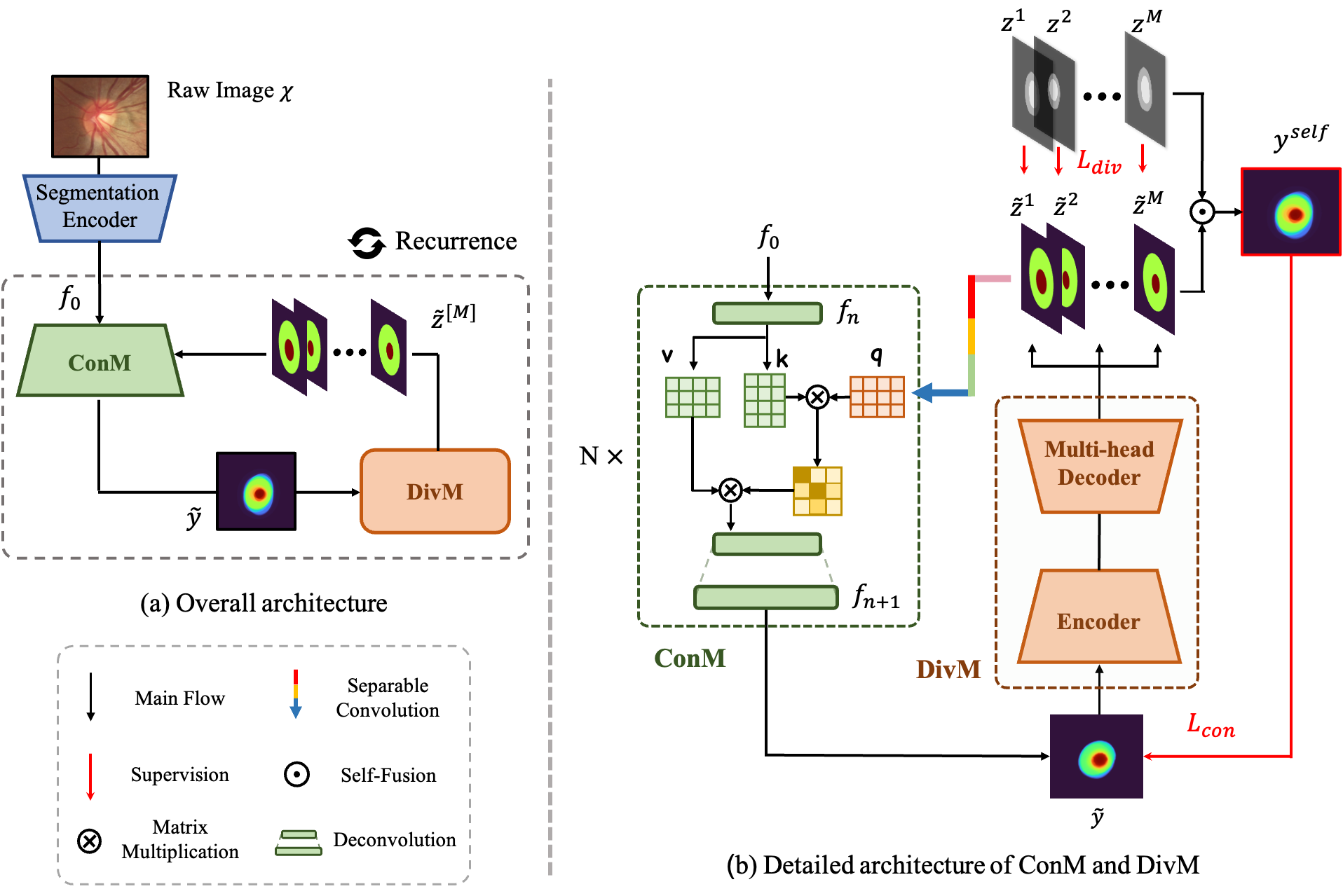 翻译:光碟(OD)和光杯(OC)从 Fundus 图像中分离出来是一项重要的基本任务。 在临床实践中,通常需要收集多位专家的意见,以获得最终的OD/OC批注。这种临床例行做法有助于减轻个人偏差。但是,当数据乘以附加说明时,标准的深层次学习模型将无法适用。在本文件中,我们提议一个新的神经网络框架,以便从多纬度说明中学习OD/OC分解。分解结果通过多纬度专家估计和校准的OD/OC分解的迭接式优化自我校准。在这种方式下,拟议方法可以实现对两个任务的共同改进,并最终获得精细化的分解结果。具体地说,我们提议了差异模型(DivMM)和趋同模型(ConM)分别处理这两项任务。DivM提供的多纬度专家图中的原始图像由DivM生成多纬度专家地图。DivM通过ConM-deal-deal-deal-deal-deal-degrational-mainal-laction abal laction laction raction atraction aclection roglegroduction ablection 由可运行的自动测试结果可以显示为可反复的自我测试结果。