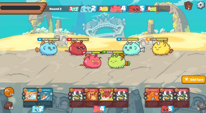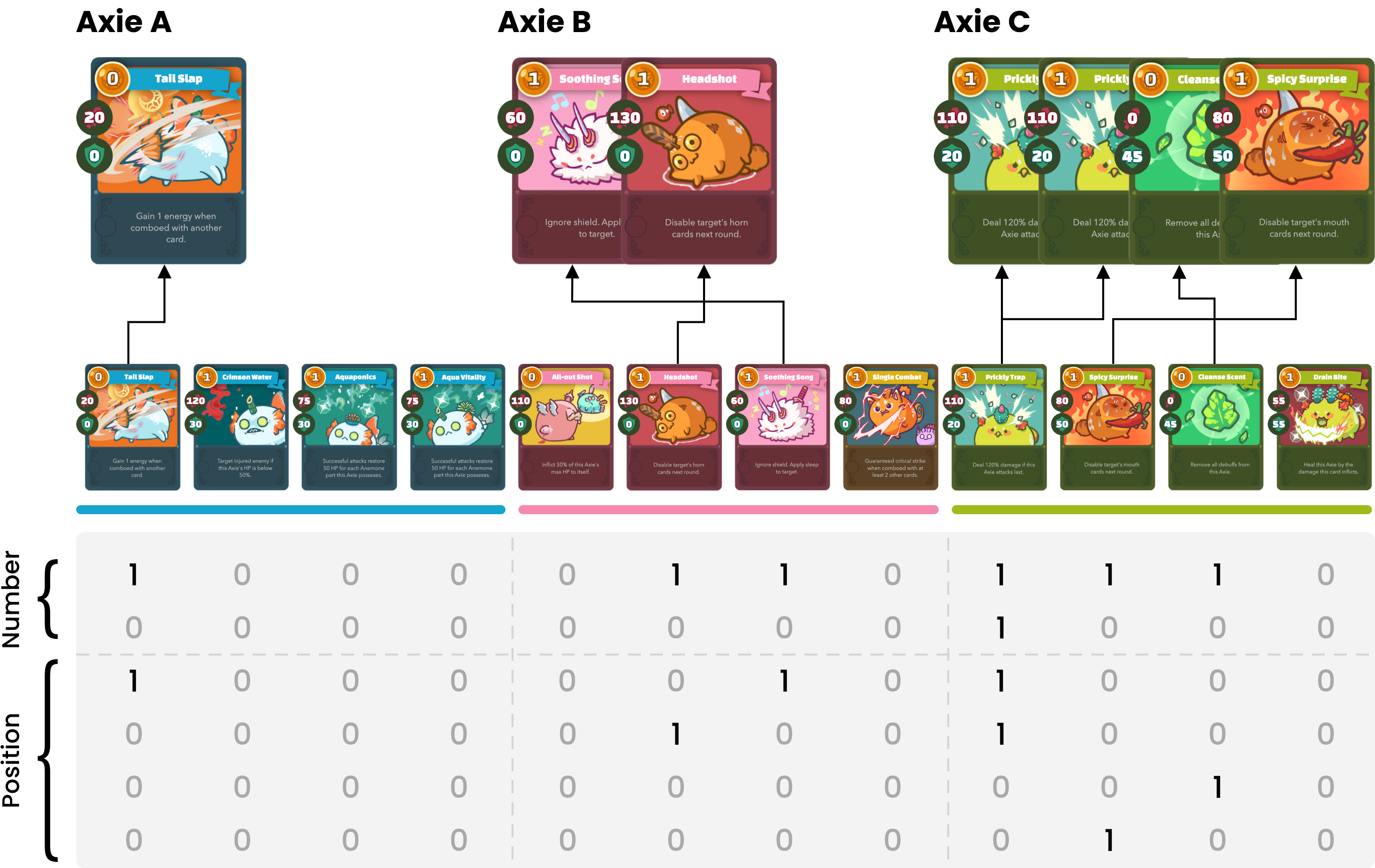 Axie infinity is a complicated card game with a huge-scale action space. This makes it difficult to solve this challenge using generic Reinforcement Learning (RL) algorithms. We propose a hybrid RL framework to learn action representations and game strategies. To avoid evaluating every action in the large feasible action set, our method evaluates actions in a fixed-size set which is determined using action representations. We compare the performance of our method with the other two baseline methods in terms of their sample efficiency and the winning rates of the trained models. We empirically show that our method achieves an overall best winning rate and the best sample efficiency among the three methods.