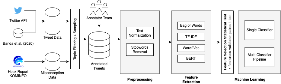 翻译:自2020年初以来,COVID-19大流行给全球造成了巨大的影响,这给社会带来了许多混乱,特别是由于通过社交媒体传播错误信息。虽然已经进行了若干项研究,涉及在社交媒体数据中发现错误信息,但大多数研究都集中在英语数据集上。关于印度尼西亚COVID-19错误信息检测的研究仍然稀缺。因此,通过这项研究,我们收集了印度尼西亚的COVID-19大流行数据集并做了注释,并建立了探测COVID-19错误信息的预测模型。数据集的构建是由一组贴上推文数据相关性和错误信息的告示员组成的团队进行的。在本研究中,我们提出了使用IndoBERT预先培训的语言模型进行两阶段分类模型,用于Tweet错误检测任务。我们还试验了其他一些文本分类基准模型。实验结果显示,将相关预测的BERT序列分类器和用于识别错误信息的Bi-LSTM组合,比其他机器学习模型精确度高87.02 %。总体来说,BERTERP的利用有助于大多数预测模型的更高性表现。我们发布了高品质的CVI-D号之间的协议。我们在印度尼西亚高质量的TRIDAD号之间协议。