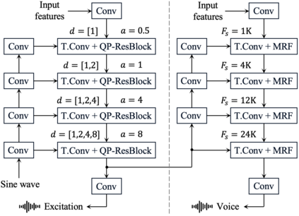 翻译:我们以前的工作,即统一源过滤器GAN(USFGAN)的vocoder,在平行的波形基因对抗网络中引入基于源过滤器理论的新结构,以实现高声质和声控。然而,高时间分辨率输入导致高计算成本。虽然HiFi-GAN(Vocoder)由于高效的扩增型发电机结构而实现了快速高纤维化语音生成,但音道控制能力受到严重限制。为了实现快速和可投放控制高纤维性神经电算器,我们将源过滤器理论引入HiFi-GAN(HiFI-GAN),通过从等级上将重音过滤网络以高频源源提示信息为基础进行调整。根据实验结果,我们提出的方法在单一的CPU上以语音质量和合成速度的语音生成比HIFI-GAN(USFGAN)和USFGGAN(USFGAN)高。此外,与USFGAN(USFGAN)vocoder不同的是,拟议方法可以很容易在实时应用和终端到终端系统中采用/整合。