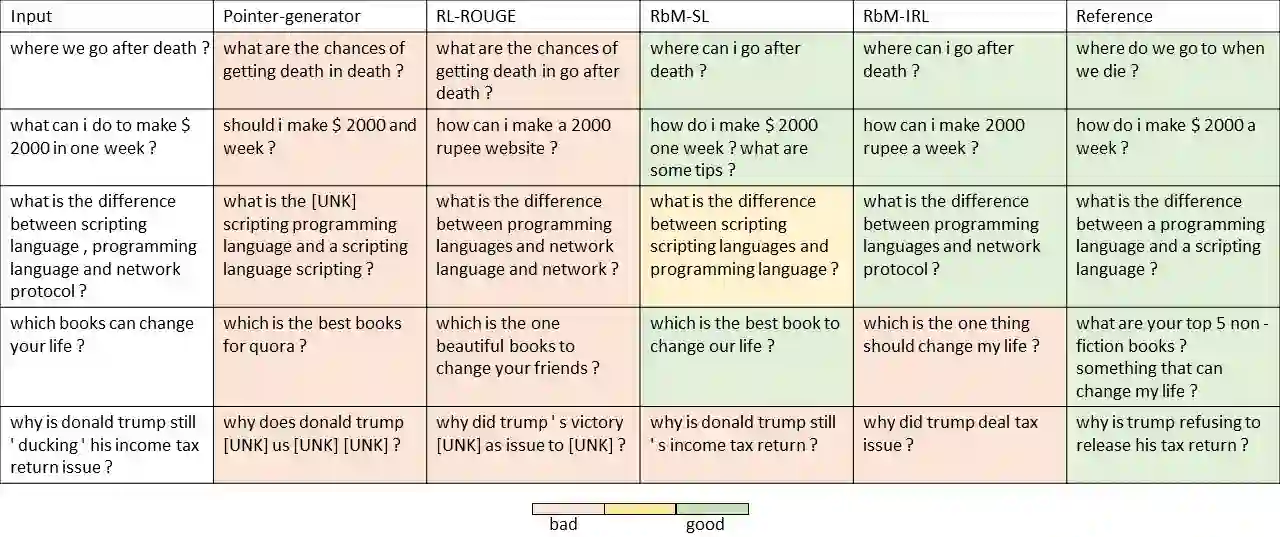 翻译:在自然语言处理(NLP)中,从某一句中自动生成自动引言句是一项重要而又具有挑战性的任务,在诸如问答、搜索和对话等若干应用中发挥着关键作用。在本文中,我们提出了对引言生成的深度强化学习方法。具体地说,我们为这项任务提出了一个新的框架,由\ textit{generator}和\textit{evulator}组成,两者都是从数据中学习的。作为从序列到序列学习模式的生成者,可以产生给定一个句子。作为深相匹配模型设计的评价者,可以判断两句子是否是彼此的引言。先是深层学习,然后通过强化学习进一步调整生成者,而评价者则给予奖励。关于评价者的学习,我们根据现有培训数据的类型,分别提出基于监督学习和反强化学习的两种方法。Empiricalalal研究显示,作为深层次评价者可以指导发电机制作更精确的引言词句。实验性结果显示,在生成模型的自动模型中,在生成模型时,在自动成型方法中展示。