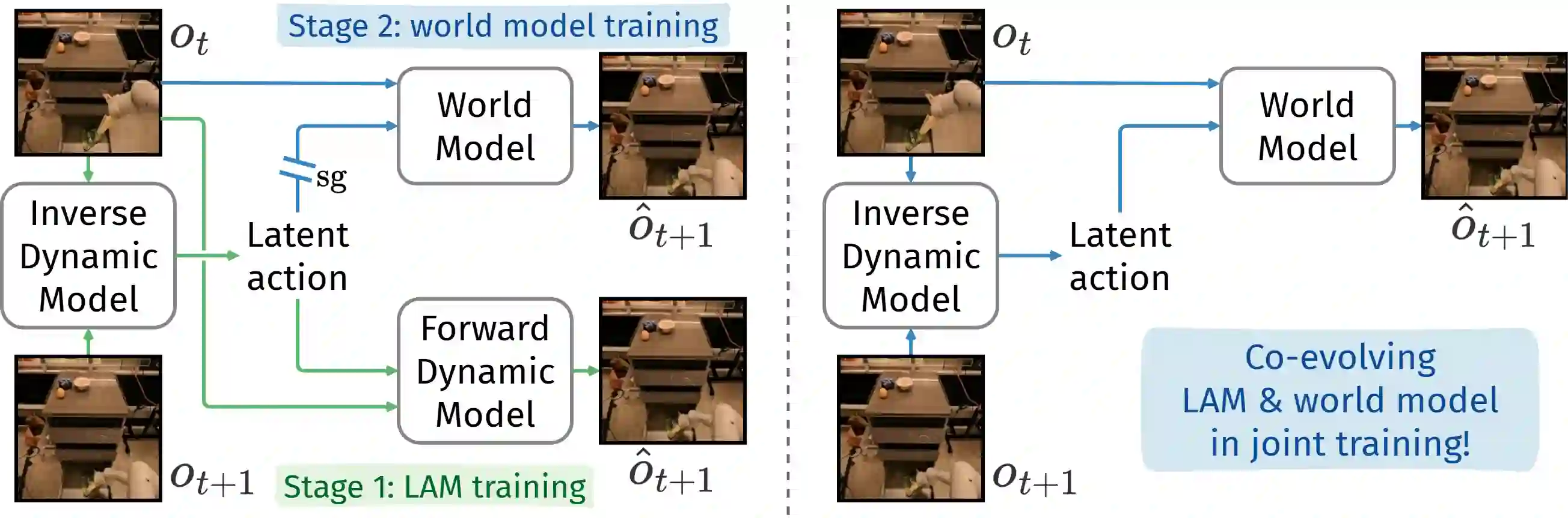 翻译:通过潜在动作将预训练的视频生成模型适配为可控世界模型,是构建通用世界模型的一个有前景的步骤。主流范式采用两阶段方法,分别训练潜在动作模型和世界模型,这导致了冗余的训练并限制了它们协同适应的潜力。一个概念上简单且吸引人的想法是直接用强大的世界模型替换潜在动作模型中的前向动态模型并进行联合训练,但这并非易事,且容易导致表征崩溃。在本工作中,我们提出了CoLA-World,首次成功实现了这种协同范式,通过一个关键的热身阶段解决了联合学习的核心挑战,该阶段有效地将从零开始的潜在动作模型表征与预训练的世界模型对齐。这开启了一个协同演化循环:世界模型充当知识渊博的导师,提供梯度以塑造高质量的潜在动作模型,而潜在动作模型则为世界模型提供了一个更精确、适应性更强的控制接口。实验表明,CoLA-World在视频模拟质量和下游视觉规划任务上均匹配或超越了先前的两阶段方法,为该领域建立了一个稳健且高效的新范式。