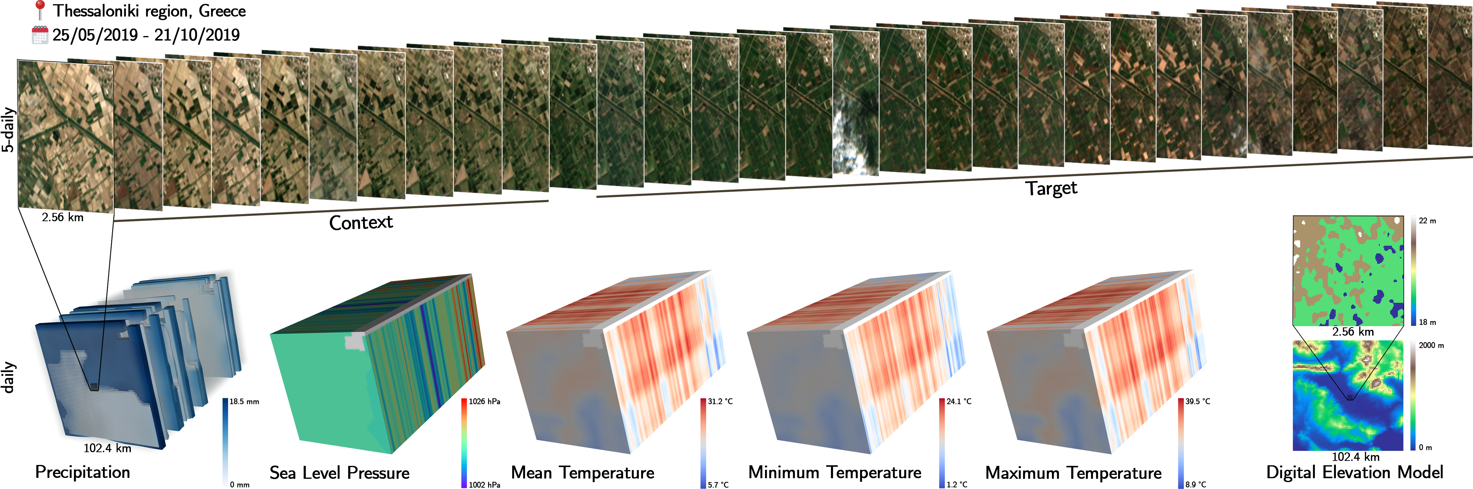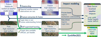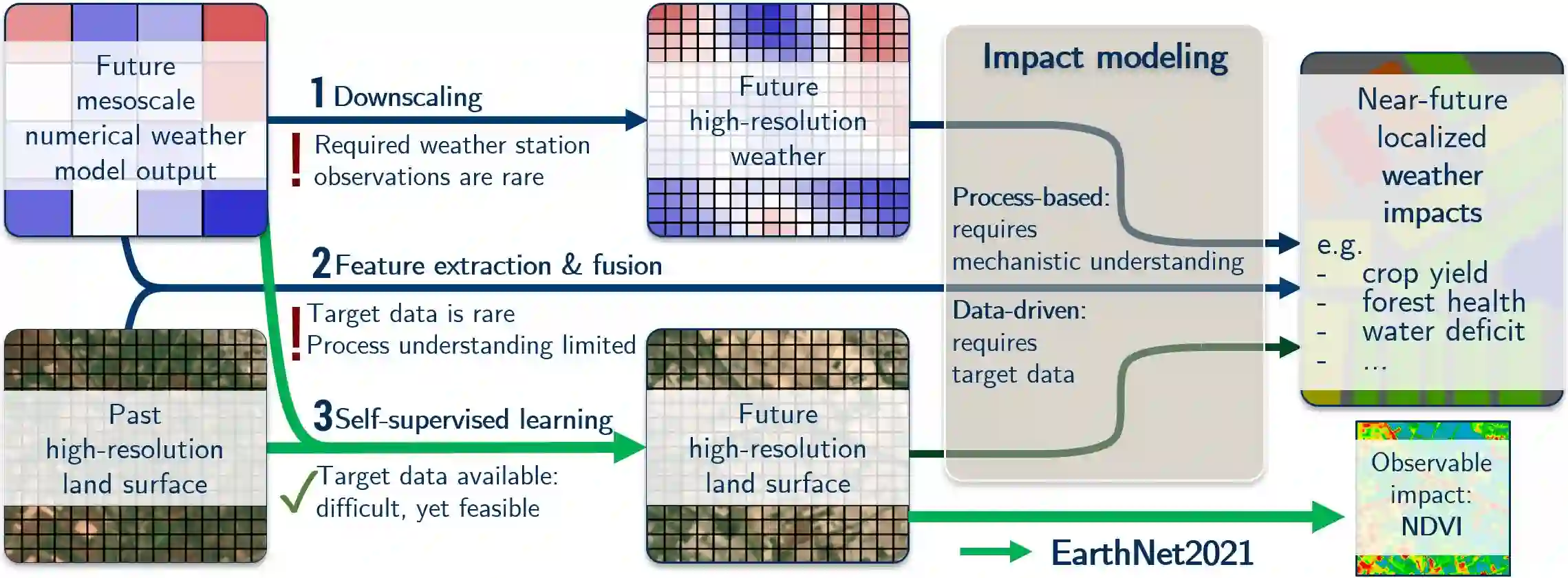 翻译:气候变化是全球性的,然而其具体影响却在同一区域不同地点之间有很大差异。季节性天气预报目前以中尺度( > 1公里)为主,季节性天气预报目前以中尺度( > 1公里)为主。为了进行更有针对性的减缓和适应,需要将影响建模小于100米。然而,驱动变量与地球表面之间的关系目前尚未被当前物理模型所解决。大型地球观测数据集现在使我们能够创建机器学习模型,能够将粗化的天气信息转化为高分辨率地球表面预报。在这里,我们定义高清晰的地球表面预报,作为以中尺度天气预报为条件的卫星图像的视频预测。视频预测已经以深层次的学习模型进行处理。因此,我们定义了EarthNet21的视频预测需要分析即时的数据集。我们引入了EarthNet201,一个包含目标阵列时钟哨2卫星图像的新型数据集,在20米线图上,与高分辨率的气象图谱(1.28公里)天气变量相匹配。通过这些模型来培训深度的神经网络网络网络网络网络。我们定义了地球网络的精确度和多层地表层预报是如何进行对比评估。我们定义了地球表面预测的模型,作为模型, 将直接地平流测测测测测测测测测测测测测测测测数据,作为模型,作为模型,作为地基的地基的地面测测测测测测测测测测的地的地的地的地基。