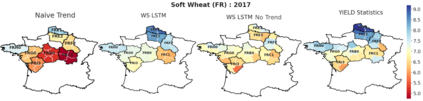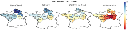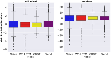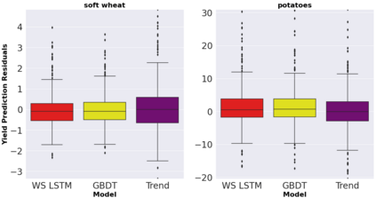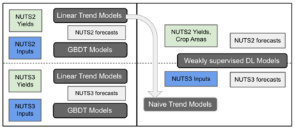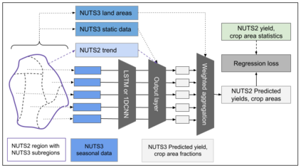 翻译:用于作物产量预测的预测投入和标签数据并非总能在同一空间分辨率中找到。我们提议一个深层次学习框架,使用高分辨率投入和低分辨率标签来制作两个空间水平的作物产量预测。预测模型由低分辨率作物面积和产量统计数据的薄弱监督加以校准。我们通过将欧洲五个国家(德国、西班牙、法国、匈牙利、意大利)和两个作物(软小麦和土豆)的区域产量从母统计区域分列到次区域,对该框架进行了评估。对受监督薄弱模型的性能与线性趋势模型和Gradient-boosted决策树(GDT)进行了比较。高分辨率作物产量预测对决策者和其他利益攸关者都有用。即使没有高分辨率产量数据,但受监督的深度学习方法也为生成此类预测提供了一种途径。