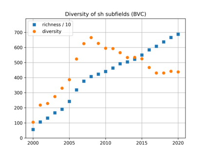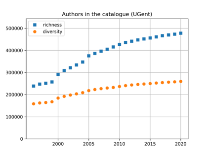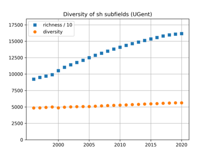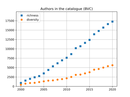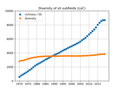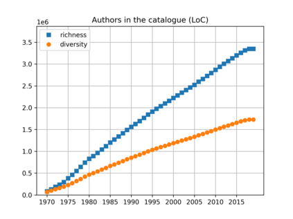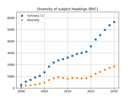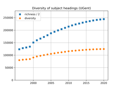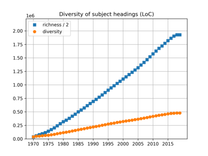 Diversity indices have been traditionally used to capture the biodiversity of ecosystems by measuring the effective number of species or groups of species. In contrast to abundance, which is correlated with the amount of data available, diversity indices provide a more robust indicator on the variability of individuals. These types of indices can be employed in the context of digital libraries to identify trends in the distribution of topics, compare the lexica employed by different authors or analyze the coverage of semantic metadata