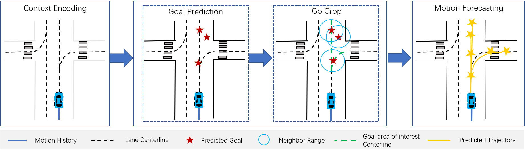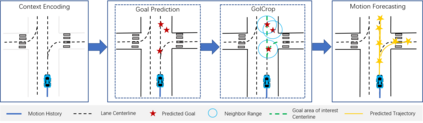 翻译:最近,大多数运动预测方法都采用基于目标的战略,即预测运动轨迹的终点,作为倒退整个轨迹的条件,以便缩小寻找解决办法的空间;但是,准确的目标坐标很难预测和评估;此外,目的地的点代表限制了对丰富道路环境的利用,在许多情况下导致不准确的预测结果。 目标领域,即可能的目的地,而不是目标协调,可以通过更多宽容和指导,为寻找潜在的轨迹提供更软的制约。 有鉴于此,我们提议一个新的基于目标的区域框架,称为目标区域网络(GANet),用于运动预测,哪些是目标区域模型,而不是精确的目标协调,作为轨迹预测的先决条件,进行更有力和准确的预测。具体地说,我们建议GoICrop(目标区域)运营商有效地提取目标区域中的语义性车道特征,而不是进行目标协调,而示范行为体的未来互动则可以提供一个更软的制约,以寻找潜在的轨迹。 有鉴于此,我们提议一个新的基于目标的区域框架,称为目标区域网络(GANet),用以为未来提交轨道图象的首页。