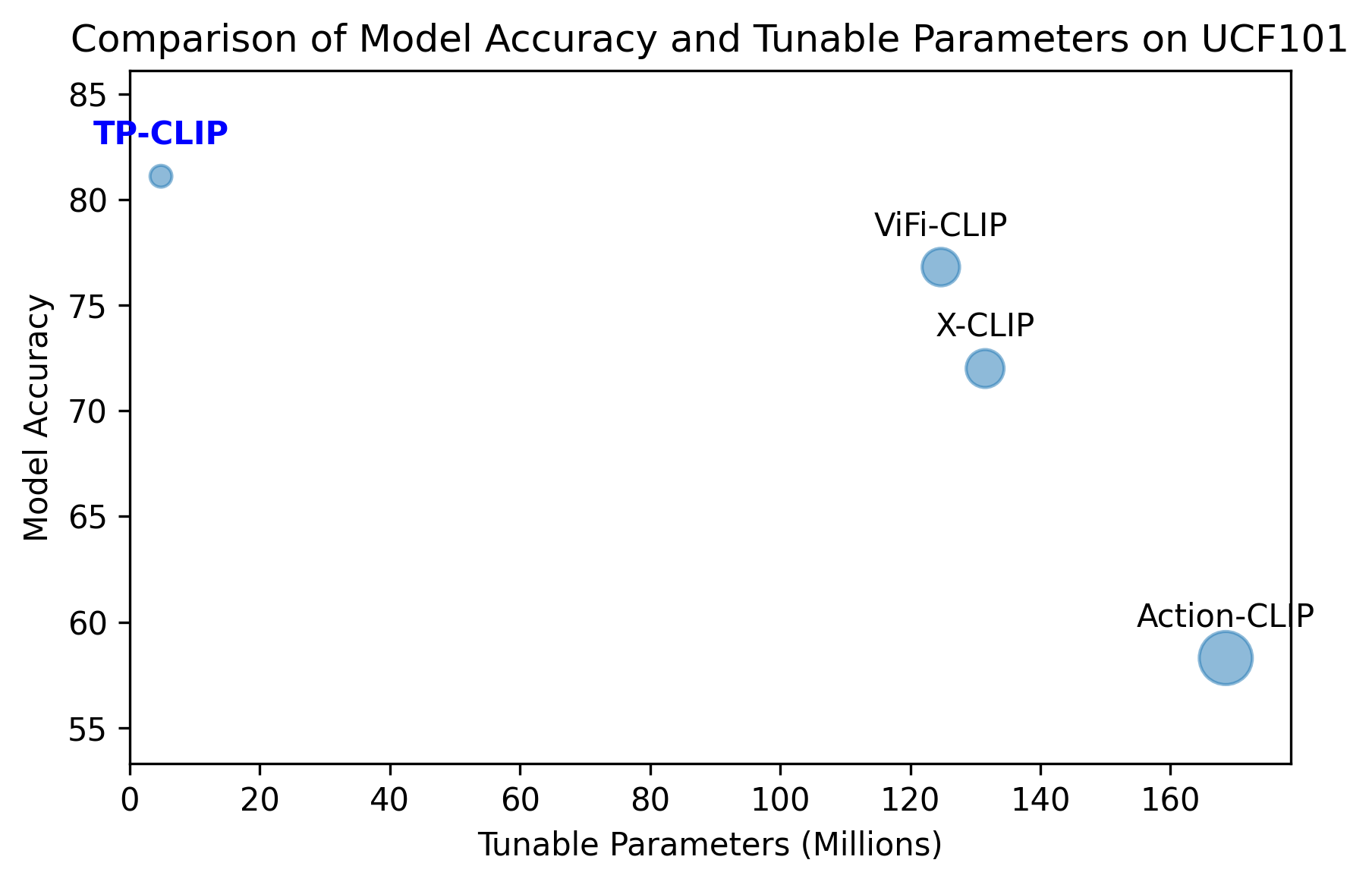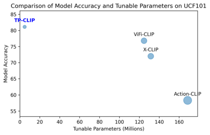 Video understanding has shown remarkable improvements in recent years, largely dependent on the availability of large scaled labeled datasets. Recent advancements in visual-language models, especially based on contrastive pretraining, have shown remarkable generalization in zero-shot tasks, helping to overcome this dependence on labeled datasets. Adaptations of such models for videos, typically involve modifying the architecture of vision-language models to cater to video data. However, this is not trivial, since such adaptations are mostly computationally intensive and struggle with temporal modeling. We present TP-CLIP, an adaptation of CLIP that leverages temporal visual prompting for temporal adaptation without modifying the core CLIP architecture. This preserves its generalization abilities. TP-CLIP efficiently integrates into the CLIP architecture, leveraging its pre-trained capabilities for video data. Extensive experiments across various datasets demonstrate its efficacy in zero-shot and few-shot learning, outperforming existing approaches with fewer parameters and computational efficiency. In particular, we use just 1/3 the GFLOPs and 1/28 the number of tuneable parameters in comparison to recent state-of-the-art and still outperform it by up to 15.8% depending on the task and dataset.