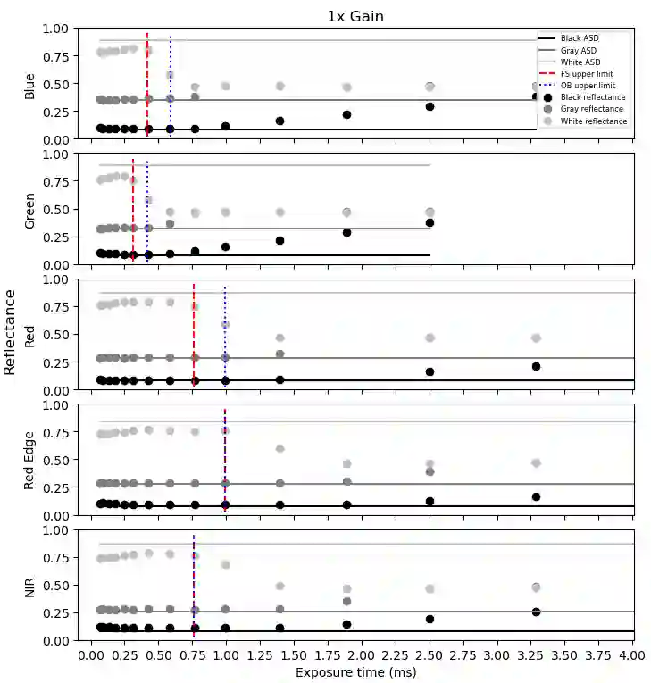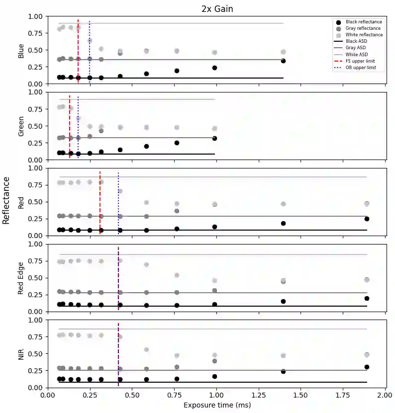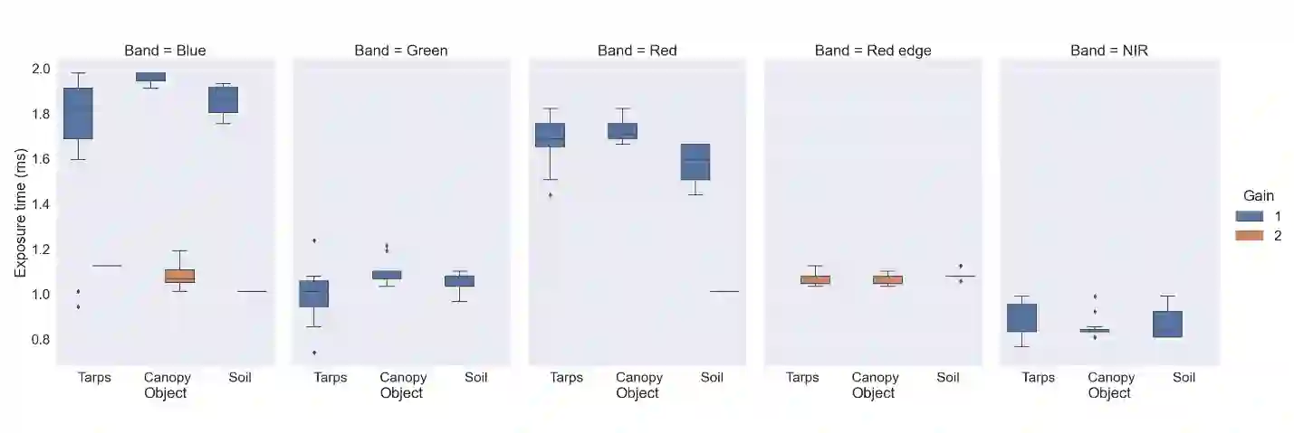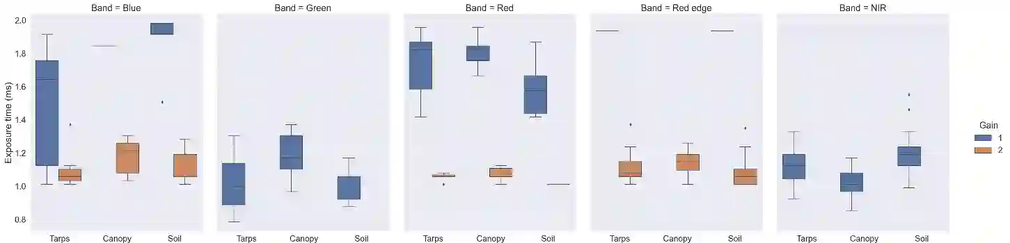 Radiometric accuracy of data is crucial in quantitative precision agriculture, to produce reliable and repeatable data for modeling and decision making. The effect of exposure time and gain settings on the radiometric accuracy of multispectral images was not explored enough. The goal of this study was to determine if having a fixed exposure (FE) time during image acquisition improved radiometric accuracy of images, compared to the default auto-exposure (AE) settings. This involved quantifying the errors from auto-exposure and determining ideal exposure values within which radiometric mean absolute percentage error (MAPE) were minimal (< 5%). The results showed that FE orthomosaic was closer to ground-truth (higher R2 and lower MAPE) than AE orthomosaic. An ideal exposure range was determined for capturing canopy and soil objects, without loss of information from under-exposure or saturation from over-exposure. A simulation of errors from AE showed that MAPE < 5% for the blue, green, red, and NIR bands and < 7% for the red edge band for exposure settings within the determined ideal ranges and increased exponentially beyond the ideal exposure upper limit. Further, prediction of total plant nitrogen uptake (g/plant) using vegetation indices (VIs) from two different growing seasons were closer to the ground truth (mostly, R2 > 0.40, and MAPE = 12 to 14%, p < 0.05) when FE was used, compared to the prediction from AE images (mostly, R2 < 0.13, MAPE = 15 to 18%, p >= 0.05).