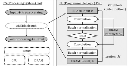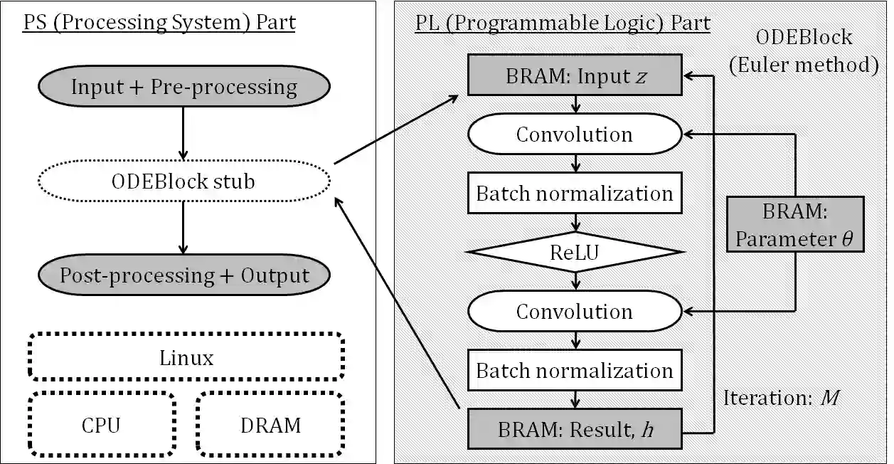 翻译:ODENet是一个深层神经网络结构,在这种结构中,ResNet的堆叠结构是用普通的差分方程(ODE)求解器执行的。它可以减少参数数量,并通过选择一个合适的求解器在准确性和性能之间取得平衡。还可以提高精确性,同时对资源有限的边缘设备保留相同数量的参数。在本文中,使用Euler方法作为ODE求解器,ODENet的一部分被作为低成本的FPGA(外地可配置门阵列)板(如PYNQ-Z2版板)的专用逻辑执行。两种变体,一个是高精度的变体,另一个是性能的变体。两种变体在FPGA板上被提出并应用,在参数大小、准确性能、执行时间和资源利用方面对FPGA进行了评价。结果显示,ODENet及其变体的总体执行时间比根据可编程逻辑执行的组合层部分时纯软件执行的时间提高到2.50倍。