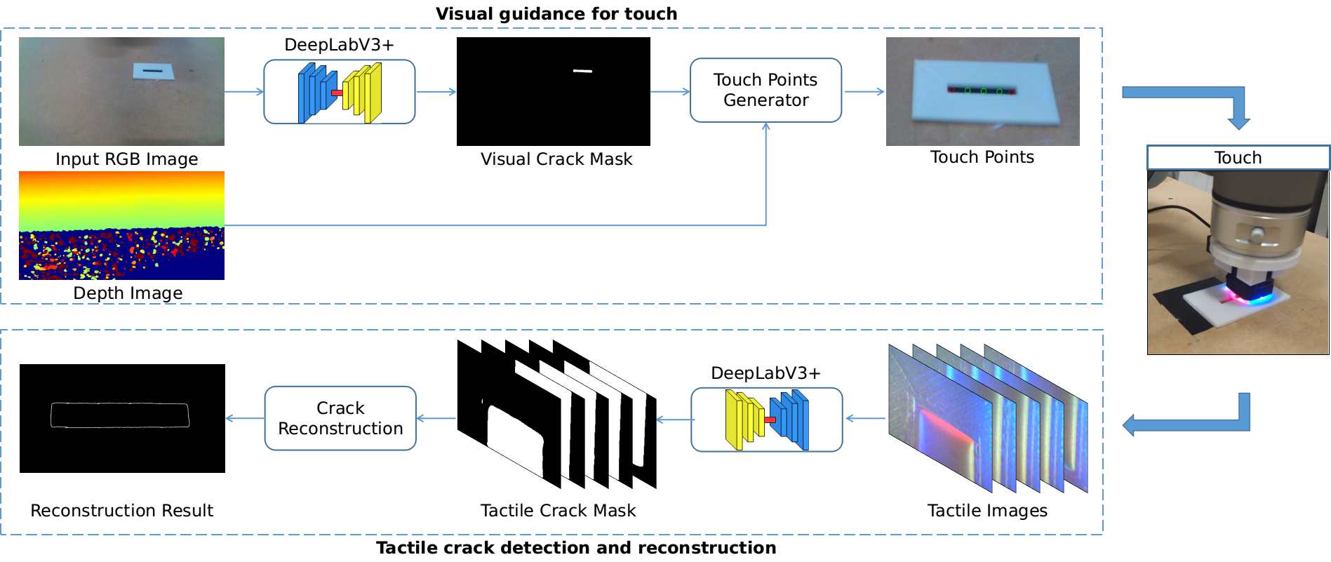 翻译:裂缝探测对于监测桥梁和地下管道等基础设施的完整性和福祉非常重要,因为桥梁和地下管道是人们可以进入的恶劣环境。近年来,计算机视觉技术被用于探测混凝土结构的裂缝,但是,由于光线条件和阴影的差异,缺乏坚固性,并导致许多假阳性,这些技术因光线和阴影的差异而受到影响。为了解决视力的不确定性,检查员积极触摸结构表面,这种视觉没有在自主裂缝探测中探索过。在本文件中,我们提出一种新的方法,用视觉引导的积极触觉感知来探测和重建混凝土结构的裂缝。鉴于一个结构的 RGB-D 图像,结构表面裂缝的粗形图将首先与精心调整的深层进化神经网络进行分割,并产生一系列联络点,以指导通过光学感应感应传感器收集触动图像。在进行接触时,只能从触摸图中获取对裂裂的像的平流面面遮掩罩,因此,根据结构结构结构的图象图象将结构结构结构的粗糙图谱进行分解,通过快速的勘测来大大改进,并对比测结果。通过不断改进的研测结果,将研测结果与机勘测结果加以改进。