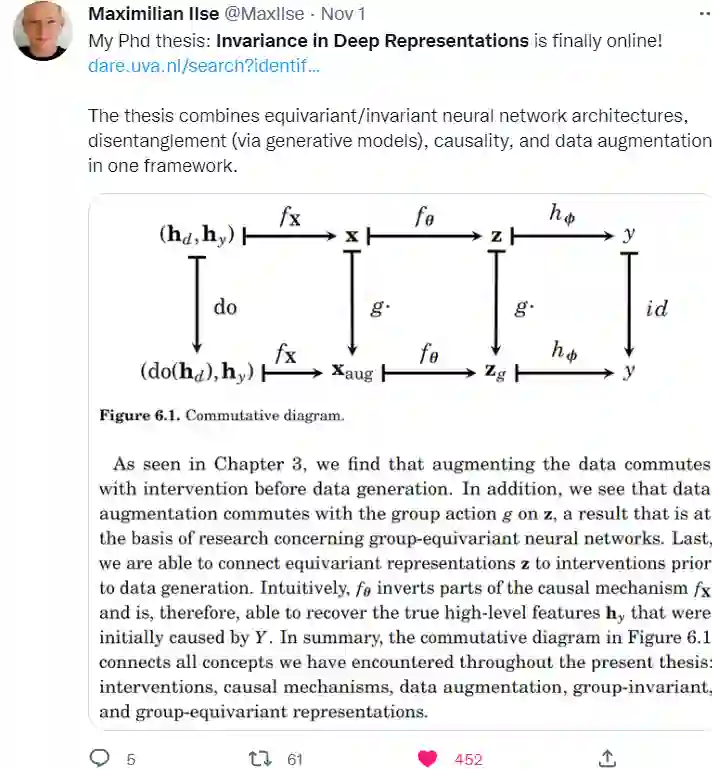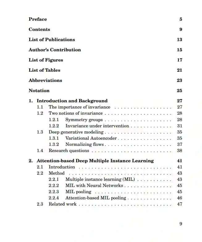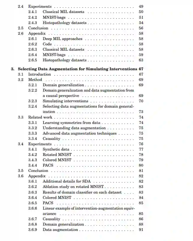 在这篇论文中,深度表示中的不变性,我们对学习不变性表示的问题提出了新的解决方案。我们采用两种不同的不变性概念。一个根植于对称群体,另一个根植于因果关系。最后,尽管它们是相互独立发展的,我们的目标是迈出统一这两个不变性概念的第一步。我们提出了一个基于神经网络的排列不变聚合算子,它对应于注意机制(第2节)。我们开发了一种新的集合分类方法。值得注意的是,所提出的基于注意力的算子的应用可以深入了解每个元素对集合标签的贡献。我们发现面向应用的研究领域,如医学成像或机器人,数据增强技术用于学习域不变特征。通过描述因果概念如何削弱观察到的域和任务标签之间的伪相关(第3节),我们演示了因果概念可以用来解释数据增强的成功。我们演示了数据增强可以作为模拟介入数据的工具。我们利用这些理论见解来推导一个简单的算法,它能够选择数据增强技术,从而导致更好的领域泛化。我们提出了一种新颖的因果减少方法(第4节),将任意数量的可能高维潜在混杂物替换为与治疗变量位于同一空间的单个潜在混杂物,而不改变因果模型所包含的观察和介入分布。在简化之后,我们使用一种灵活的转换类参数化简化的因果模型,称为规范化流。我们提出了一种从观测数据和介入数据联合估计参数化简化模型的学习算法。我们提出了域不变变分自动编码器(第5节),这是一种生成模型,通过学习三个独立的潜在子空间来解决域移位问题,一个用于域,一个用于类,一个用于任何残留变化。我们表明,由于我们的模型的生成特性,我们也可以合并来自已知或以前未见领域的未标记数据。