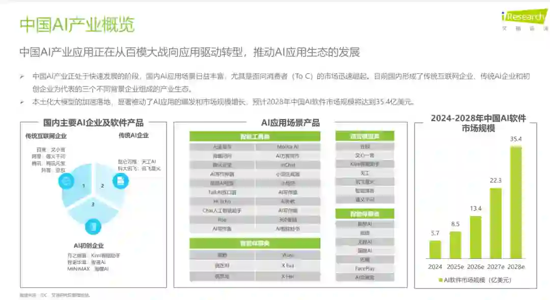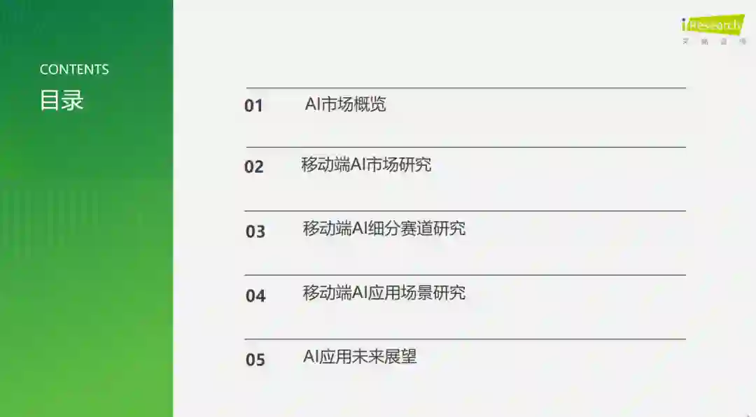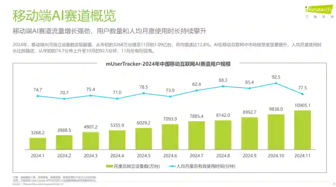 全球人工智能市场正快速发展,中美作为主要引领者,推动技术、产品和应用的多轮驱动。大语言模型(包括多模态大模型)的崛起提升了AI能力和使用时间,而中国在应用场景方面展现了显著优势。 用户对移动端AI应用的接受度和使用意愿持续增强,市场潜力巨大。国内移动端AI应用用户主要为男性,学历以大学及以上为主,职业分布中企业普通职员占近四分之一,新一线城市用户使用率超前,整体认知水平高。用户对AI的认知度不断提升,社交媒体和工作学习是主要信息来源。超过60%的用户在生活、工作和学习场景中积极使用AI产品,倾向于探索多种不同类型的应用。豆包、文小言和ChatGPT在语言生成类应用中最受欢迎。用户普遍认为AI能提高工作效率,最常在工作场景中开始使用,知晓AI使用技巧以知乎式提问为主。用户满意度高,但希望改善回答准确性和办公软件集成。66.8%受访者有付费意愿,倾向于按月订阅,购买时重视使用便捷性和专业内容生成。 2024年移动端AI应用市场呈现明显的分化趋势。在用户规模和使用时长方面,语言模型类应用占据主导地位,其中豆包月活跃用户达4686.8万,与Kimi智能助手、文小言共同构成千万级应用阵营。值得注意的是,新兴AI应用Kimi智能助手凭借创新功能实现十个月45.0%的高速增长。在智能伴聊赛道,星野APP通过差异化社交体验成功突围,用户规模较年初翻倍,月均使用时长增至66.5分钟。图像处理和智能工具赛道虽用户基数较小,但随着移动设备算力提升和AI算法优化,用户需求正加速向移动端迁移。这表明移动端AI应用正从通用型工具向场景化、专业化方向演进,用户对细分功能的需求日益明确,未来市场将进一步向专业化、差异化方向发展。 2024年移动端AI应用呈现全场景覆盖态势,主要渗透生活、工作学习、娱乐休闲和亲子教育四大领域。超60%用户在生活场景使用AI产品,56%应用于工作学习,用户普遍采用高频率(每天或每周1-3次)、中等时长(10-60分钟)的使用模式。在用户画像方面,亲子教育场景内高学历人群和高收入人群的占比格外显著。付费意愿集中在数据安全和专业内容生成功能,但普遍期待低价订阅模式(1-20元/月)。这表明移动端AI应用正从通用工具向场景化精细运营转型,未来发展重点在于场景深耕与差异化服务。 在未来的AI应用发展中,技术与用户体验的升级将成为关键。通过优化智能交互,提高回答准确性和对话自然度,AI将更好地满足用户需求。同时,强化本地化能力和隐私保护将提升用户的使用体验。场景化服务的深化将集中在生活与工作学习领域,增强办公软件的协同能力,并发展专家助手和云端协作功能。此外,针对高学历用户的专业化应用将不断扩展,提供一站式解决方案,以提升教育和办公场景的效率。这些举措将推动AI应用的全面升级,形成更为完善的用户体验和服务生态。