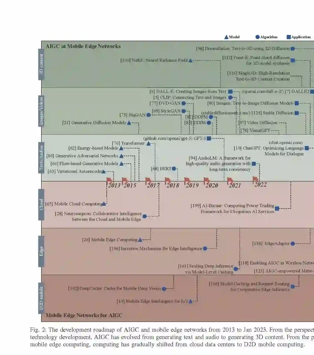 与PGC和UGC相比,AIGC在内容创造方面的优势已经显而易见。具体来说,生成式AI模型可以在几秒钟内产生高质量的内容,并提供为用户需求量身定制的个性化内容[2]。随着时间的推移,AIGC的性能得到了显著提高,这是由增强的模型、增加的数据可用性和更大的计算能力[12]驱动的。一方面,先进的模型[4],如扩散模型,为跨模态AIGC生成提供了更强大的工具。这些进展归功于生成式人工智能模型的基础性研究,以及生成式深度神经网络(DNN)中学习范式和网络结构的不断细化。另一方面,随着网络日益互联,用于生成式人工智能训练和推理的数据和计算能力变得更加容易获得[9],[13]。例如,需要数千个GPU的AIGC模型可以在云数据中心进行训练和执行,使用户能够通过核心网络提交频繁的数据生成请求。
