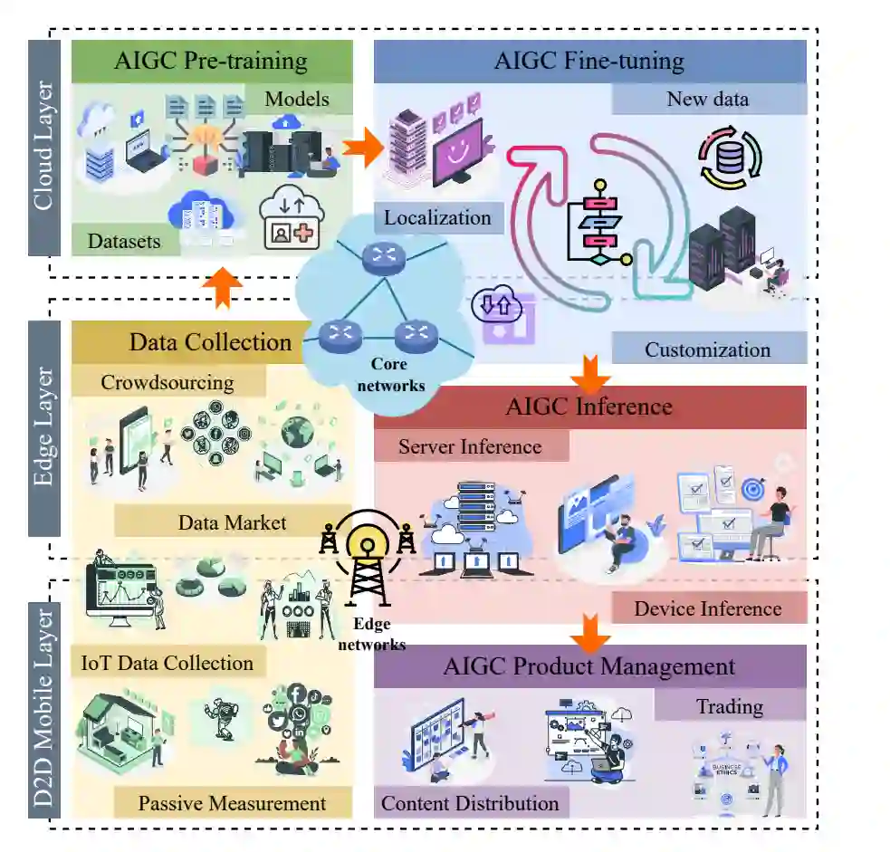 图1移动AIGC网络概述,包括云层、边缘层、D2D移动层。AIGC服务的生命周期,包括数据收集、预训练、微调、推理和产品管理,在核心网络和边缘网络之间循环。