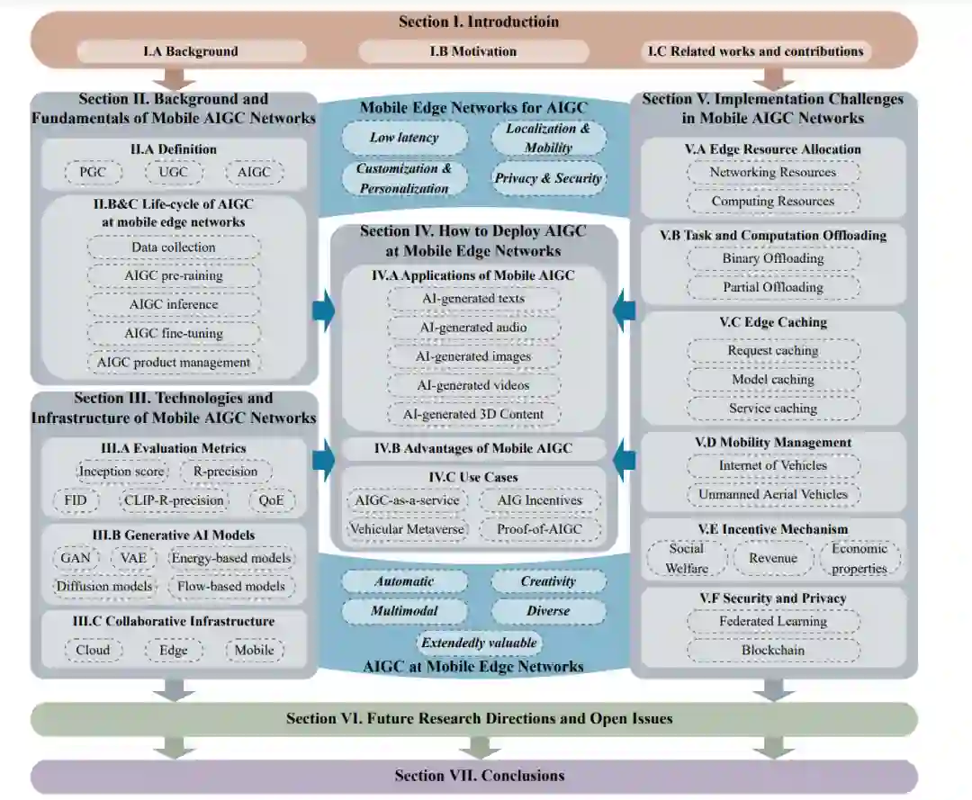 如图3所示,调研的组织如下。第二节考察了AIGC的背景和基础。第三部分介绍了移动AIGC网络的技术和协作基础设施。第四节讨论了移动AIGC网络的应用和优势,第五节展示了潜在的用例。第六节讨论了实现中的挑战。第七部分探讨了未来的研究方向。第八节提出结论。