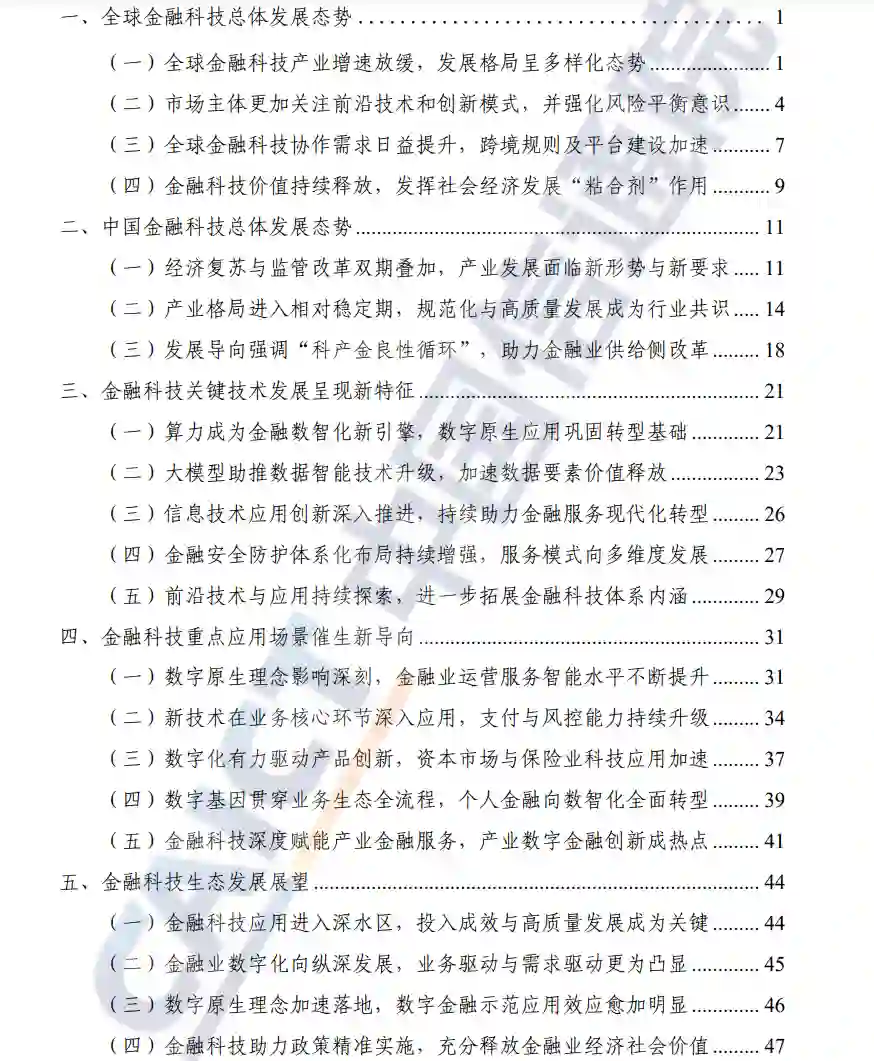 - 金融业对数字化技术应用需求不断提升,金融科技“工具箱”进一步丰富。数字原生理念在金融业逐步深化,算力能力成为金融业数智化发展的新焦点,大模型、数据智能技术加速金融业数据要素价值释放,金融信创走向深水区,助力金融应用现代化转型。同时,安全防护体系化、服务化发展,正在成为构建数字金融安全底座的新风向。另外,量子计算、5G-Advanced等前沿技术发展,进一步丰富了金融科技体系的内涵。