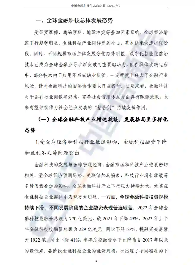 - 受全球经济和金融市场不稳定的影响,金融科技投融资规模持续下行。不同区域发展速度明显分化,非洲、南美等新兴市场表现出较大增长潜力。金融科技市场主体不断加快对前沿技术的探索,寻求新的场景突破,同时也高度重视新技术给金融市场带来的风险。金融业数字化发展以及数据要素价值释放,对于多个国家和地区建设信用体系与弥补数字鸿沟发挥着重要作用。为应对数字金融发展带来的新挑战,各国政府、国际组织、大型企业加快探索并积极推进金融科技跨境协作规则和互操作性平台建设。