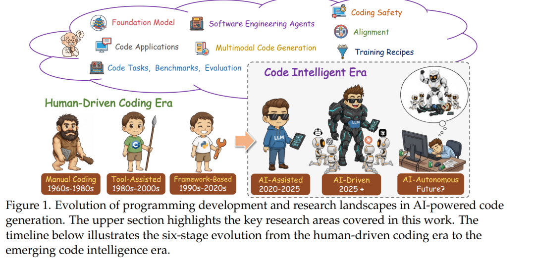 大型语言模型(Large Language Models,LLMs)通过实现从自然语言描述到可执行代码的直接转换,从根本上重塑了自动化软件开发范式,并推动了包括 GitHub Copilot(Microsoft)、Cursor(Anysphere)、Trae(字节跳动)以及 Claude Code(Anthropic)等工具的商业化落地。尽管该领域已从早期的基于规则的方法演进至以 Transformer 为核心的架构,但其性能提升依然十分显著:在 HumanEval 等基准测试上的成功率已从个位数提升至 95% 以上。 在本文中,我们围绕代码大模型(code LLMs)提供了一份全面的综合综述与实践指南,并通过一系列分析性与探测性实验,系统性地考察了模型从数据构建到后训练阶段的完整生命周期。具体而言,我们涵盖了数据整理、高级提示范式、代码预训练、监督微调、强化学习,以及自主编码智能体等关键环节。 我们系统分析了通用大语言模型(如 GPT-4、Claude、LLaMA)与代码专用大语言模型(如 StarCoder、Code LLaMA、DeepSeek-Coder 和 QwenCoder)的代码能力,并对其所采用的技术手段、设计决策及相应权衡进行了深入评估。 进一步地,本文明确指出了学术研究与实际部署之间的研究—实践鸿沟:一方面,学术研究通常聚焦于基准测试与标准化任务;另一方面,真实世界的软件开发场景则更加关注代码正确性、安全性、大规模代码库的上下文感知能力,以及与现有开发流程的深度集成。基于此,我们系统梳理了具有应用潜力的研究方向,并将其映射到实际工程需求之中。 最后,我们通过一系列实验,对代码预训练、监督微调与强化学习进行了全面分析,涵盖尺度定律(scaling law)、训练框架选择、超参数敏感性、模型结构设计以及数据集对比等多个关键维度。