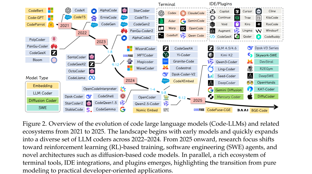大型语言模型(Large Language Models,LLMs)[66, 67, 192, 424, 435, 750, 753, 755, 756] 的出现引发了自动化软件开发领域的范式转变,从根本上重塑了人类意图与可执行代码之间的关系 [1306]。现代 LLM 在多种代码相关任务中展现出卓越能力,包括代码补全 [98]、代码翻译 [1158]、代码修复 [619, 970] 以及代码生成 [139, 161]。这些模型有效地将多年积累的编程经验提炼为可遵循指令的通用工具,使不同技能水平的开发者都能够基于 GitHub、Stack Overflow 及其他代码相关网站中的数据进行使用和部署。 在众多 LLM 相关任务中,代码生成无疑是最具变革性的方向之一。它使自然语言描述能够直接转化为可运行的源代码,从而消解了领域知识与技术实现之间的传统壁垒。这一能力已不再局限于学术研究,而是通过一系列商业化与开源工具成为现实,包括:(1) GitHub Copilot(Microsoft)[321],在集成开发环境中提供智能代码补全;(2) Cursor(Anysphere)[68],一款支持对话式编程的 AI 原生代码编辑器;(3) CodeGeeX(智谱 AI)[24],支持多语言代码生成;(4) CodeWhisperer(Amazon)[50],与 AWS 服务深度集成;以及 (5) Claude Code(Anthropic)[194] / Gemini CLI(Google)[335],二者均为命令行工具,允许开发者直接在终端中将编码任务委托给 Claude 或 Gemini [67, 955],以支持智能体化(agentic)的编码工作流。这些应用正在重塑软件开发流程,挑战关于编程生产力的传统认知,并重新界定人类创造力与机器辅助之间的边界。 如图 1 所示,代码生成技术的演进轨迹揭示了一条清晰的技术成熟与范式变迁路径。早期方法受限于启发式规则和基于概率文法的框架 [42, 203, 451],在本质上较为脆弱,仅适用于狭窄领域,且难以泛化到多样化的编程场景。Transformer 架构的出现 [291, 361] 并非简单的性能提升,而是对问题空间的根本性重构:通过注意力机制 [997] 与大规模训练,这类模型能够捕获自然语言意图与代码结构之间的复杂关联。更为引人注目的是,这些模型展现出了涌现式的指令遵循能力,这一能力并非显式编程或直接优化的目标,而更像是规模化学习丰富表征的自然结果。这种通过自然语言使非专业用户也能生成复杂程序的“编程民主化”趋势 [138, 864],对 21 世纪的劳动力结构、创新速度以及计算素养的本质产生了深远影响 [223, 904]。 当前代码 LLM 的研究与应用格局呈现出一种通用模型与专用模型并行发展的双轨结构,二者各具优势与权衡。通用大模型,如 GPT 系列 [747, 750, 753]、Claude 系列 [66, 67, 192] 以及 LLaMA 系列 [690, 691, 979, 980],依托包含自然语言与代码在内的超大规模语料,具备对上下文、意图及领域知识的深度理解能力。相较之下,代码专用大模型(如 StarCoder [563]、Code LLaMA [859]、DeepSeek-Coder [232]、CodeGemma [1295] 和 QwenCoder [435, 825])则通过在编程导向数据上的聚焦式预训练与任务特定的架构优化,在代码基准测试中取得了更优性能。诸如 HumanEval [161] 等标准化基准上从个位数到 95% 以上成功率的跃迁,既体现了算法层面的创新,也反映了对代码与自然语言在组合语义与上下文依赖方面共性的更深刻理解。 尽管相关研究与商业应用发展迅速,现有文献中仍然存在创新广度与系统性分析深度之间的显著鸿沟。现有综述多采取全景式视角,对代码相关任务进行宽泛分类,或聚焦于早期模型阶段,未能对最新进展形成系统整合。尤其值得注意的是,最先进系统所采用的数据构建与筛选策略仍缺乏深入探讨——这些策略在数据规模与数据质量之间进行权衡,并通过指令微调方法使模型行为与开发者意图对齐。相关对齐技术包括引入人类反馈以优化输出、高级提示范式(如思维链推理与小样本学习)、具备多步问题分解能力的自主编码智能体、基于检索增强生成(Retrieval-Augmented Generation, RAG)的事实约束方法,以及超越简单二值正确性、从代码质量、效率与可维护性角度进行评估的新型评价框架。 如图 2 所示,Kimi-K2 [957]、GLM-4.5/4.6 [25, 1248]、Qwen3Coder [825]、Kimi-Dev [1204]、Claude [67]、DeepSeek-V3.2-Exp [234] 以及 GPT-5 [753] 等最新模型集中体现了上述创新方向,但其研究成果分散于不同文献之中,尚缺乏统一、系统的整合。表 1 对多篇与代码智能或 LLM 相关的综述工作进行了比较,从八个维度进行评估:研究领域、是否聚焦代码、是否使用 LLM、是否涉及预训练、监督微调(SFT)、强化学习(RL)、代码 LLM 的训练配方,以及应用场景。这些综述覆盖了通用代码生成、生成式 AI 驱动的软件工程、代码摘要以及基于 LLM 的智能体等多个方向。尽管多数工作关注代码与应用层面,但在技术细节覆盖上差异显著,尤其是强化学习方法在现有综述中鲜有系统讨论。 为此,本文对面向代码智能的大语言模型研究进行了全面而前沿的系统综述,对模型的完整生命周期展开分析,涵盖从初始数据构建、指令调优到高级代码应用与自主编码智能体开发等关键阶段。 为了从代码基础模型出发,系统性地覆盖智能体与应用层面,本文进一步提供了一份贯通理论基础与工程实现的详细实践指南(见表 1)。本文的主要贡献包括: 1. 提出统一的代码 LLM 分类体系,系统梳理其从早期 Transformer 模型到具备涌现式推理能力的指令调优模型的发展脉络; 1. 系统分析从数据构建与预处理、预训练目标与架构创新,到监督指令微调与强化学习等高级微调方法的完整技术流水线; 1. 深入探讨定义当前最优性能的前沿范式,包括提示工