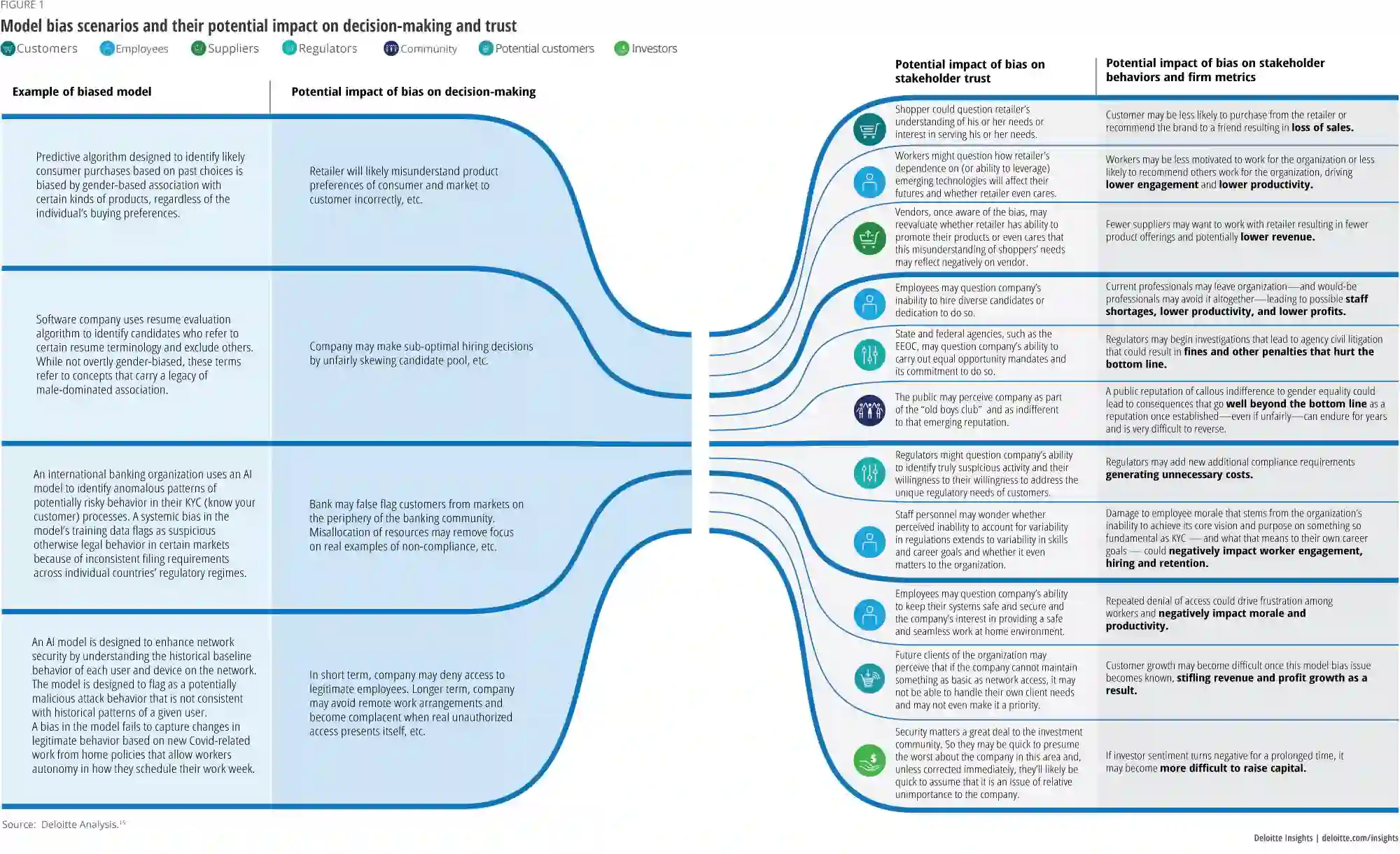 模型偏差的影响通常不限于一个利益相关者群体。相反,最常导致的错误决策通常会影响多个利益相关者群体,并可能对其信任组织的意愿产生负面影响。 为了说明模型偏差的个体特征,我们描述了一些不同的案例场景,其中模型偏差的性质可能会表现出来,以及决策和信任如何因此受到影响(下图)。