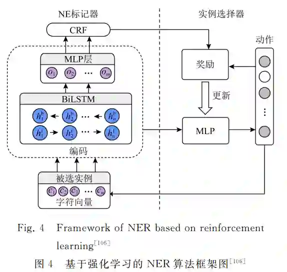 **命名实体识别旨在对序列进行命名实体标注, 判断输入句子中的词是否属于人名、地名、组织机构 名等.现有命名实体识别方法依赖人工标注数据,但 标 注 成 本 较 高.远 程 监 督 方 法 可 以 降 低 标 注 成 本[15],但远程监督获得的训练样本中又存在噪声. 强化学习方法可以通过自主学习选择高质量的训练 样本数据,解决上述问题.目前,基于强化学习的命 名实体识别方法思路主要有2类:1)使用深度强化 学习模型自动学习样本选择策略,过滤掉训练数据 中的噪声.2)将命名实体识别任务利用强化学习来 建模,即将序列标注任务转换为序列决策问题.通过 利用 Markov决策过程模型来进行序列标注,即为 序列中的每个元素分配一个标签.