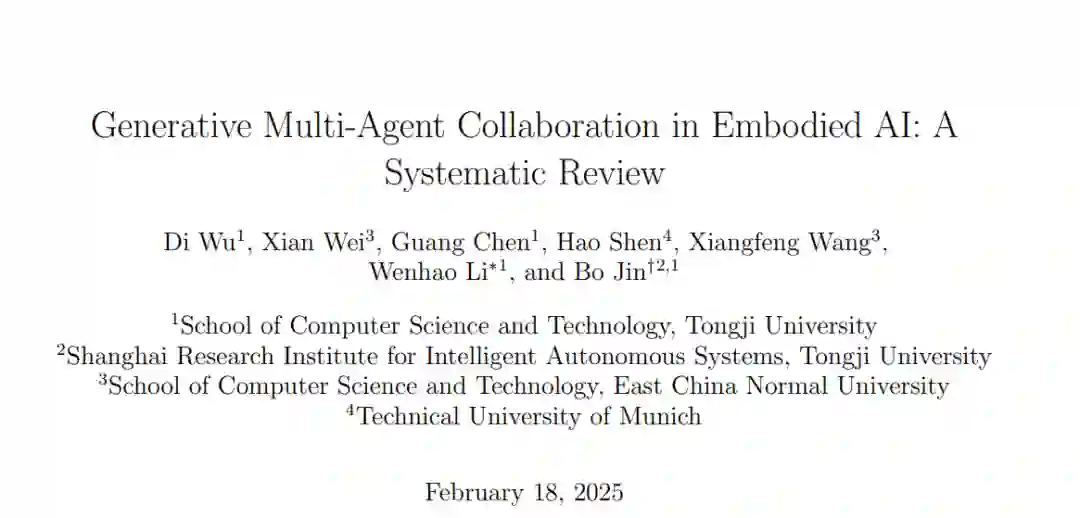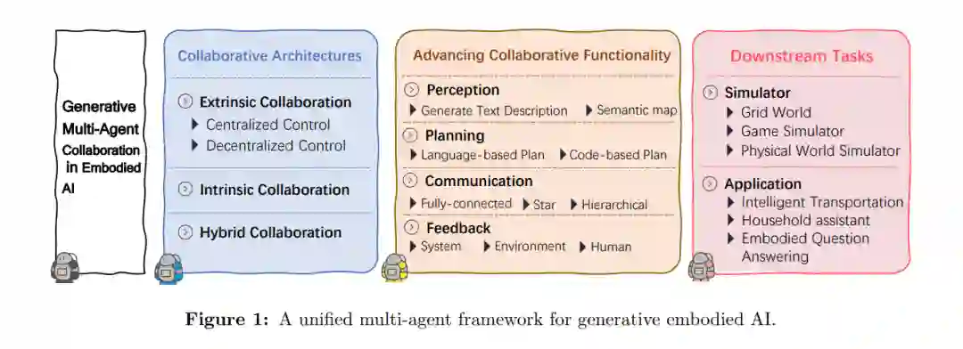 具身多智能体系统(EMAS)因其在智能交通、物流和制造等领域的巨大潜力,吸引了越来越多的关注 [YJ+13, IS+18]。通过将物理具身(从自动驾驶车辆到机器人操作臂)与多智能体系统(MAS)[DKJ18] 集成,EMAS 提供了一种去中心化、协作的方法,能够高效地处理复杂任务。尽管这些优势显而易见,但设计和实现有效的 EMAS 仍然是一项非凡的挑战,通常需要对控制论的专业知识、广泛的训练数据以及精心设计的强化学习范式 [LB08, OD23]。 在传统的 MAS 中,智能体通过分配责任、共享状态信息并共同适应动态环境来协作 [DKJ18]。虽然这些原则在某些特定领域取得了显著成功,但传统方法在以下方面面临关键的局限性:难以推广到新任务 [MS+22],难以扩展到大规模的智能体群体 [CTE+22],以及应对突发环境变化 [WR04]。这些方法通常依赖于狭窄训练的模型,可能表现脆弱或仅限于特定领域 [YZ+23]。这些不足凸显了需要更加灵活和稳健的解决方案的紧迫性,这些解决方案能够在开放式和快速变化的具身场景中蓬勃发展。 近期基础模型(FMs,例如大型语言模型、大型模型或视觉语言模型(VLMs))[ZLL+24] 的突破为推进 MAS 向更加自适应和生成行为的发展开辟了新的途径。通过为智能体提供自然语言能力、情境推理以及生成新解决方案的能力,基于基础模型的 MAS 超越了纯信号驱动或强化学习框架中固有的局限性 [GCW+24, CLH+24, LP+24]。这些“生成型智能体”能够以语义丰富的方式进行沟通,与人类级别的流畅度协作,并能够迅速应对突发挑战,调整策略。因此,基于 FM 的智能体可能会彻底改变多智能体协作的方式——无论是在由具身设备组成的物理空间,还是在智能体共享抽象知识和任务的虚拟空间中。 在此背景下,EMAS 领域将能够从这些 FM 方面的最新进展中获益。通过将物理具身与生成型多模态智能结合,未来的系统可能会采用更广泛的设计空间,整合复杂的感知、高级语言和视觉推理能力,以及自适应决策能力。然而,现有文献中关于具身 AI 和多智能体系统的综述通常将这些领域视为孤立的,未能在它们的交集处进行系统性的探讨 [IS+18, DYT+22, GCW+24, MS+24, HRS24]。基于 FM 的生成型智能体如何最好地融入 EMAS 的系统化视角仍在不断发展中。 本综述旨在提供对生成型多智能体协作在具身 AI 中现状的全面和结构化的分析,如图 1 所示。首先,在第 2 节中,我们提出了一种分类法,根据模型数量和具身类型对现有的 EMAS 解决方案进行分类,强调协作如何在物理智能体和纯粹虚拟语义环境中产生。接下来,在第 3 节中,我们探讨了多智能体协作的主要构建块——系统感知、规划、沟通和反馈,并分析了如何设计这些组件以利用基于 FM 的生成能力。超越理论视角,在第 4 节中,我们深入探讨了实践应用,展示了生成型多智能体协作如何增强不同具身场景中的功能。根据我们的了解,这是首次系统性地探讨 MAS、具身 AI 和基础模型的融合。最后,在第 5 节中,我们总结了开放的研究挑战,勾画了关键的未来发展方向,并讨论了 EMAS 对更广泛的 AI 和机器人领域的潜在影响。我们的目标是通过呈现这个迅速发展的领域的整体概述,来为研究人员、从业人员和利益相关者提供信息并激发灵感。