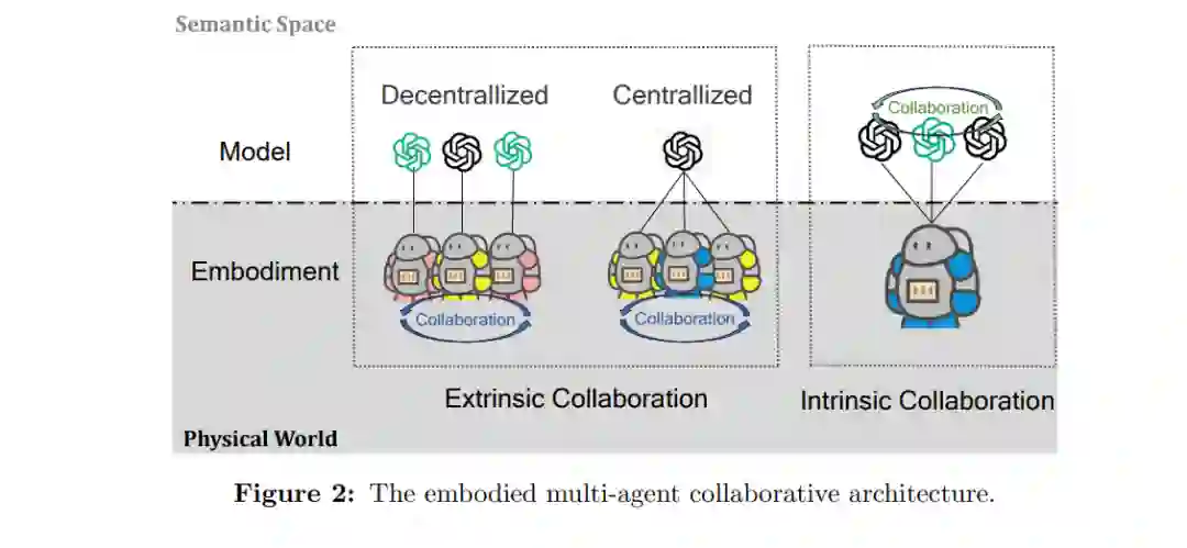 在多个具身实体之间展开的协作场景中,我们称之为外部协作,智能体在物理或虚拟环境中互动,以实现共享的目标。借鉴长期以来的多机器人和传统多智能体系统(MAS)文献,外部协作可以通过集中式或去中心化策略组织。这些方法在可扩展性、通信开销以及全局控制与局部控制之间存在不同的权衡。集中式架构 在集中式策略框架中,单一的统一模型控制多个机器人或智能体,提供集中式的任务分配和决策制定。该集中模型根据智能体的能力和系统目标分配任务,通过提供全局视角确保智能体之间的协调。已有研究探索了基于语言的任务分配方法 [LTW+24, OA+24, CYZ+24] 和基于代码的任务分配方法 [KVM24, ZQW+24]。 集中式模型还在决策制定中发挥关键作用,通过整合来自所有智能体的信息来做出最终决策,确保一致性。例如,[YKC23] 使用集中式模型来确定导航目标,[TXL+20] 使用它来进行基于 3D-CNN-LSTM 的互动问答,[GAZ+24] 使用它在多机器人系统中通过引导领导机器人行动来解决死锁问题。 集中控制策略通过使用单一模型进行任务分配和决策制定来确保协调。其优势包括任务的最优分配和一致的决策。然而,它可能受到系统复杂性、高计算需求以及在大规模或动态环境中的可扩展性问题的限制。