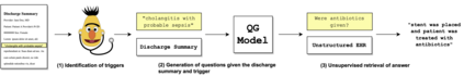 现有的源自电子健康记录(EHR)的问题回答(QA)数据集是人为生成的,因此不能捕捉到真实的医生信息需求。我们提出了出院总结临床问题(DiSCQ),这是一个新策划的问题数据集,由2,000多个问题与提示每个问题的文本片段(触发器)搭配而成。这些问题是由医学专家从100多个MIMIC-III出院总结中产生的。我们分析了这个数据集,以确定医学专家所寻求的信息类型的特点。我们还训练了触发器检测和问题生成(QG)的基线模型,与EHR上的无监督答案检索相搭配。我们的基线模型能够在超过62%的情况下生成高质量的问题,这些问题是由人类选择的触发器提示的。我们发布了这个数据集(以及重现基线模型结果的所有代码),以促进对现实的临床质量保证和QG的进一步研究。