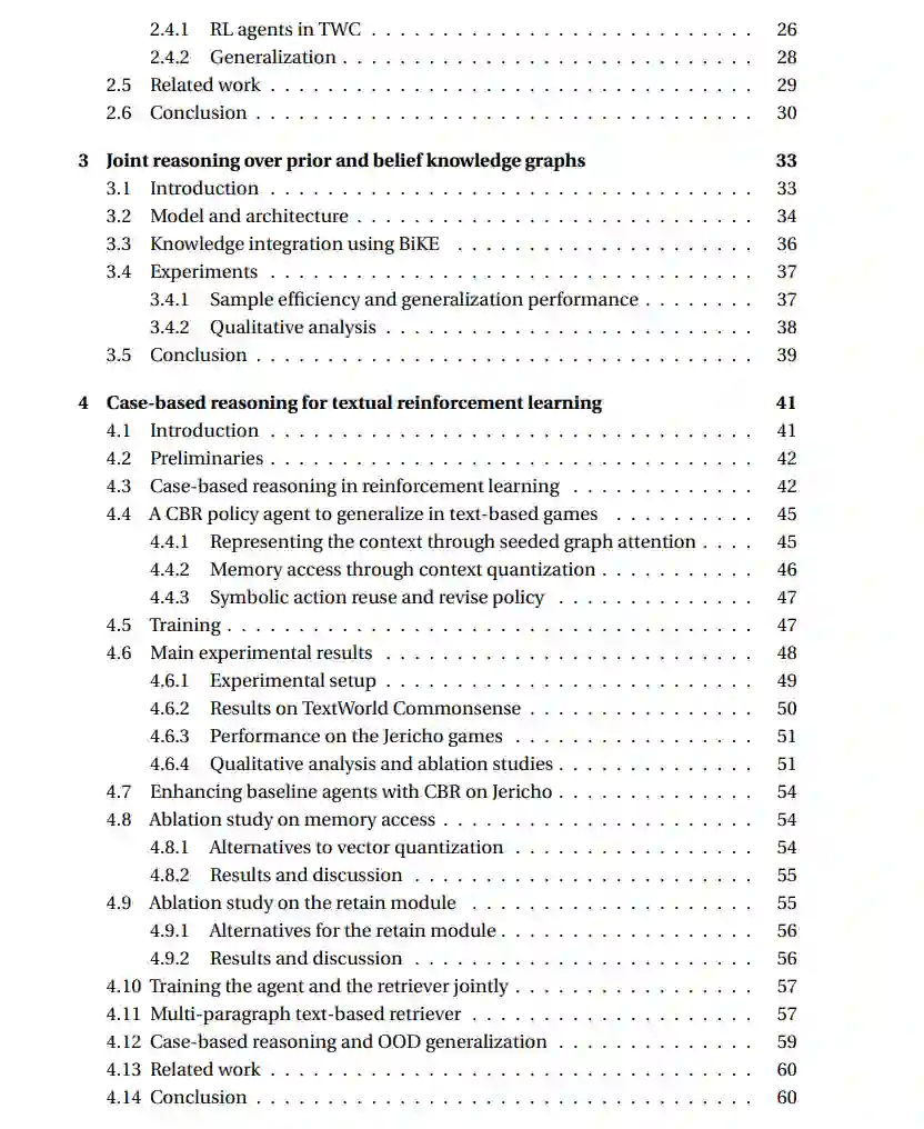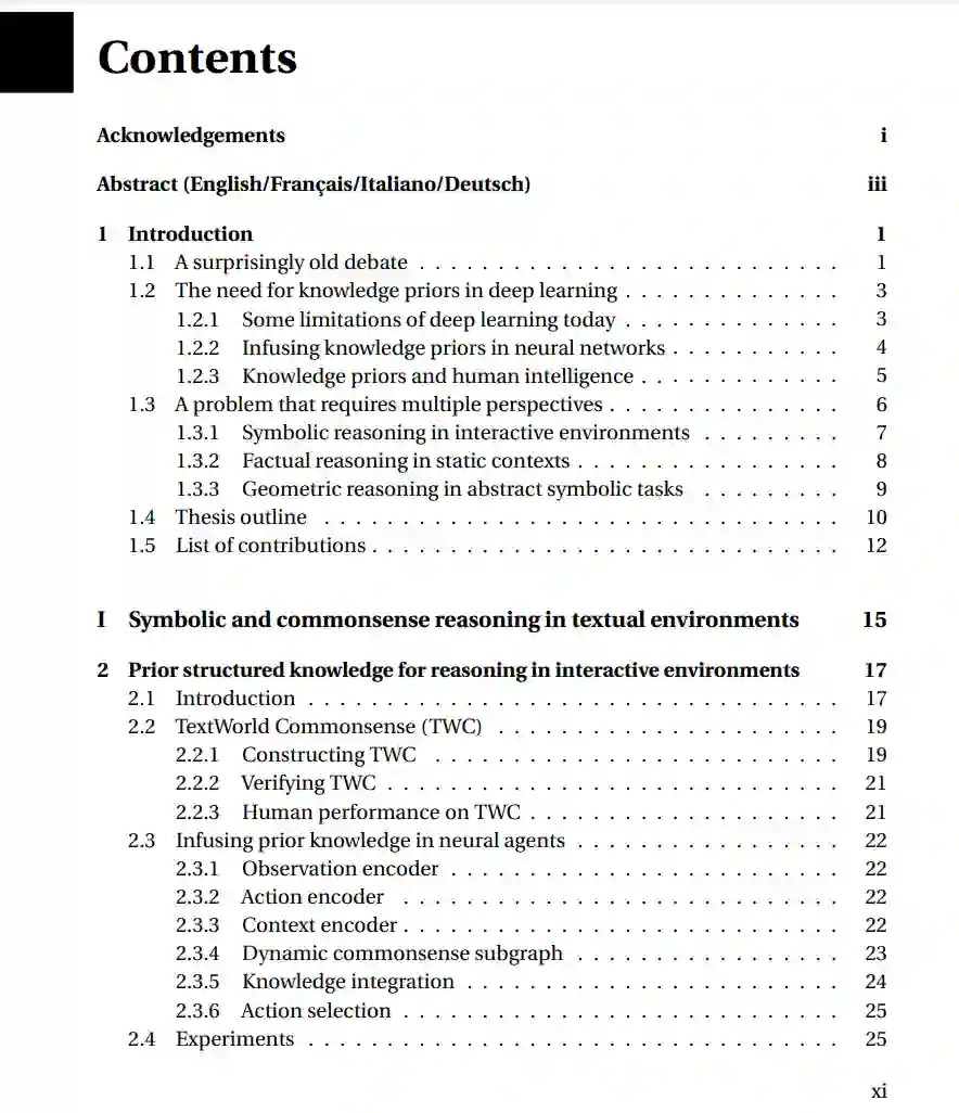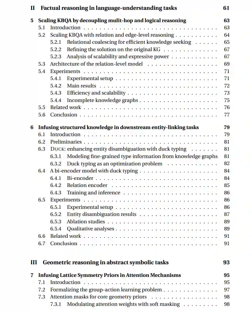 人类智能的标志是推理、计划和解决高度抽象问题的能力。最近在深度神经网络推动下,人工智能取得了显著进展,革新了计算机视觉和自然语言处理等领域。然而,尽管我们见证了这些令人惊叹的进步,创建能够高效获取人类级别推理能力的模型仍然是一个挑战。为了取得进展,至关重要的是承认所有模型固有的归纳偏差,并且人类级别的智能无法完全泛化,需要合适的知识先验的引入。本研究遵循这一思路,旨在通过引入适当的知识先验和结构化表示来增强神经网络的推理能力。由于问题的复杂性,我们计划从多个角度进行研究。论文分为三个主要部分,每一部分都聚焦于不同的任务和视角。论文的第一部分围绕交互式文本环境中的推理和计划展开研究。我们引入了新的环境来评估神经代理的常识推理能力和决策能力。随后,我们探讨了图结构表示是否可以作为知识表示和推理的适当归纳偏差。我们提出了使用图作为先验知识来源和世界状态模型的代理,显示出它们在样本效率方面的优越性。此外,我们引入了一种基于案例推理的通用算法,用于训练策略内代理,改善其计划和分布外泛化能力。在第二部分中,我们将核心事实推理挑战隔离开来,研究语言模型如何推理以及如何从先验知识中受益。我们深入研究了语言理解任务,并介绍了一种高效方法来导航大规模知识图谱,并回答需要复杂逻辑推理和分布鲁棒性的自然语言问题。随后,我们提出了一种通过在潜在空间中注入适当结构来增强语言模型在实体链接任务中的先验知识的方法,显示了显著的改进。最后,受发展科学的启发,我们关注于人类智能的核心知识先验,重点研究几何和拓扑先验。我们引入了一种变体的Transformer模型,结合了格对称性先验,显示出其在基本几何推理任务上比标准Transformer高两个数量级的样本效率。本论文的贡献涵盖了多个方面。我们在多个基准上取得了最先进的结果,包括流行的文本环境、标准问答和实体链接数据集以及几何推理任务。我们的基于文本的神经代理在样本效率和分布鲁棒性方面优于基线模型。提出的问答模型在规模上比竞争方法高出几个数量级,并实现了训练分布外的组合泛化。我们的实体链接方法在参数数量是大规模生成模型的十八分之一的情况下,实现了可比的结果。