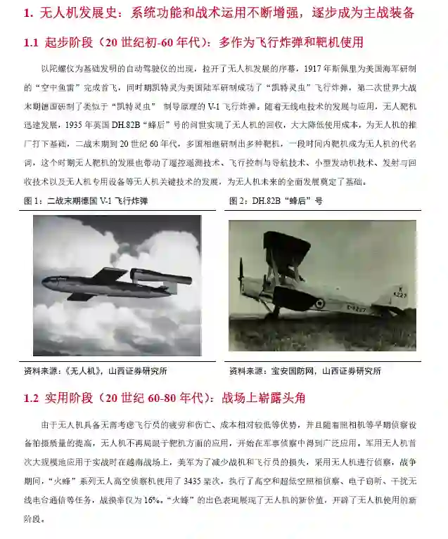 系统功能和战术运用不断增强, 无人机逐步成为主战装备。20 世纪 60年代起步阶段, 无人机多作为飞行炸弹和靶机使用。随着照相机等早期侦察设备拍摄质量的提高, 无人机开始在军事侦察中得到广泛应用, 战场上崭露头角。2001 年阿富汗反恐战争中, 无人机首次携带武器攻击地面目标, 开启“察打一体” 无人机潮流, 之后的多次局部战争中, 各类无人机被综合运用协同作战, 从小规模应用的支援性配角成长为常态化运用的主力装备。我国无人机发展虽然起步晚, 但发展较快, 目前已达世界先进水平。