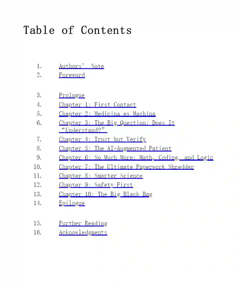 https://www.pearson.com/en-us/subject-catalog/p/the-ai-revolution-in-medicine-gpt-4-and-beyond/P200000011399/9780138200138 人工智能即将改变医学。这是你现在需要知道的。 “人工智能的发展与个人电脑的发明一样具有根本性。它将改变人们工作、学习和交流的方式,并改变医疗保健。但必须谨慎管理,以确保其利大于弊。看到人工智能在医学领域的机会和责任的早期探索,我感到很鼓舞。” ——比尔盖茨 就在几个月前,数以百万计的人被ChatGPT惊人的能力和怪异的幻觉所震惊。但那是在2022年。GPT-4现在就在这里:更智能,更准确,具有更深入的技术知识。GPT-4及其竞争对手和追随者即将改变医学。但在生命攸关的情况下,你需要了解这些技术。 他们能做什么?他们还不能做什么?他们有什么不该做的?要做出决定,请亲自体验最前沿的技术。请加入三位提前几个月接触过GPT-4的业内人士,因为他们揭示了GPT-4的巨大潜力——改善诊断、总结患者访问、简化流程、加速研究等。您将看到真实的GPT-4对话——未经排练和未经过滤,精彩和笨拙都一样——都配有宝贵的上下文、坦率的评论、真实的风险洞察和最新的收获。 用真正的人工智能助手预览医生的一天生活。 看看人工智能如何增强医生和病人在床边或更远的会面。 了解现代人工智能是如何工作的,为什么它会失败,以及如何通过测试来赢得信任。 增强患者的权能:改善可及性和公平性,填补护理空白,并支持行为改变。 通过“即时工程”提出更好的问题并得到更好的答案。 利用人工智能来减少浪费、发现欺诈、简化报销和降低成本。 与AI作为研究合作者优化临床试验并加速治愈。 找到正确的护栏,为监管机构和政策制定者提供关键见解。 描绘可能的未来:接下来会有什么梦想? 从未有过这样的技术。无论你是医生、病人、医疗保健负责人、支付人、政策制定者还是投资者,人工智能都将深刻影响你,它可能会决定你的生死。通过这本书,你要见多识广,做好准备,负起责任。