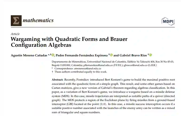 图 1. Brauer 配置代数、Bert Kostant 的博弈以及平方数和三角数的混合和允许在本文中找到主要结果。定理 9 给出了与引入的兵棋推演相关的布劳尔配置代数和相应中心的维数公式。这样的定理允许使用三角数的普遍和来确定地面基地探测器的发射是成功还是未能探测到对手发射的导弹。定理 10 给出了类似的结果,但我们没有使用三角数的全和,而是使用平方数的全和。推论 1 将Legendre–Gauss定理应用于三个平方数之和,以确定哪些条件允许对手在拟议的兵棋推演中取得成功。
