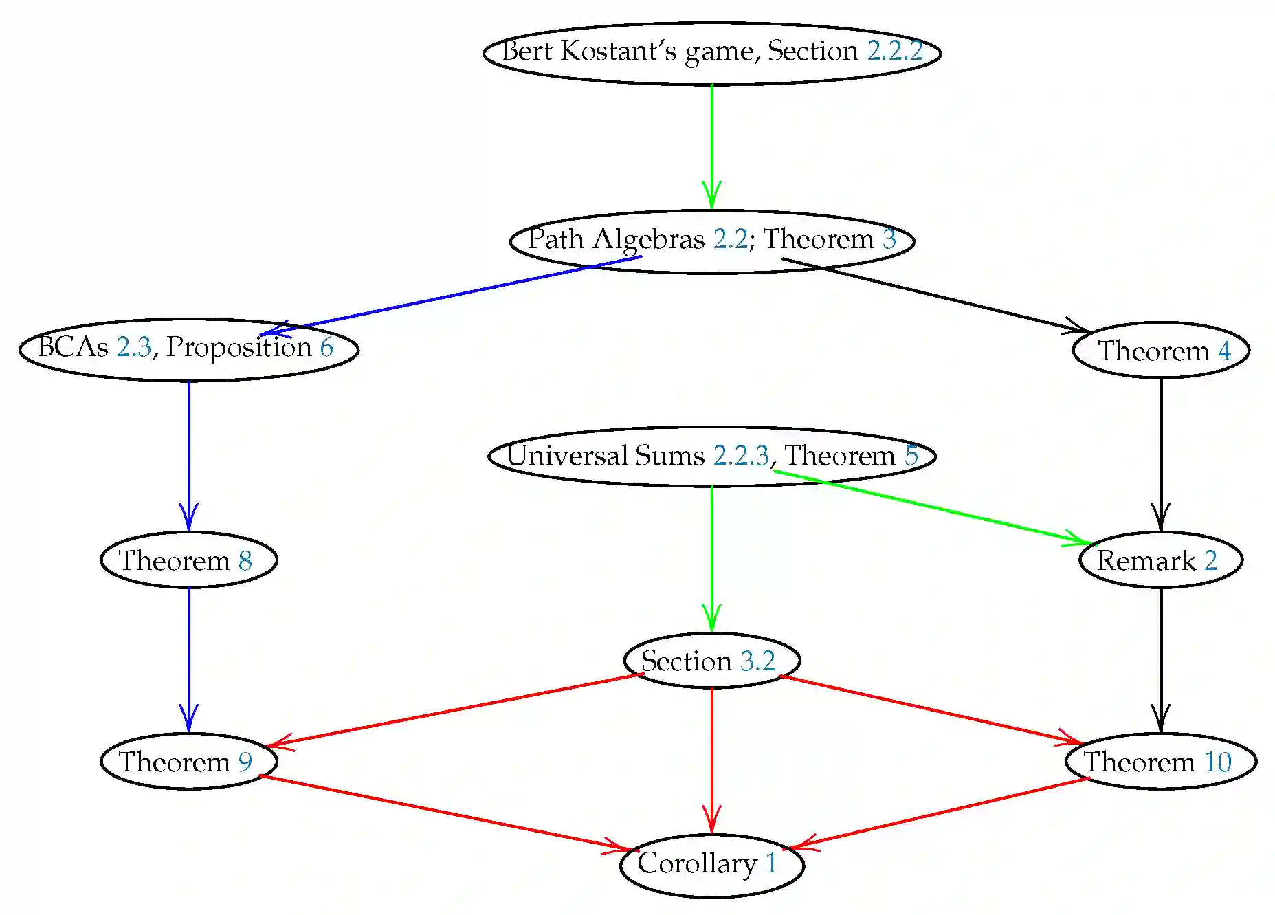 本文结构如下:第 2 节回顾了本文中使用的定义和符号。特别是,回顾了 Bert Kostant 博弈的概念及其一些变体。本节还描述了有关 Brauer 配置代数以及二次形式、这些类型的博弈和路径代数之间的联系。第 3 节给出了主要结果。定义了一个兵棋推演,其结果基于一些可接受的路径以及三角数和平方数的混合和。结束语和可能的未来工作在第 4 节中描述。