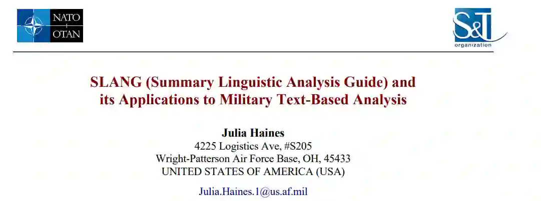本文将演示和讨论SLANG(语言分析指南摘要)工具,该工具是专门为美国防部建设开发的文本分析应用。美空军拥有大量的基于文本的数据,但没有一致的方法将其转化为定量结果。调查、合同和许多其他数据源为决策者提供了有价值的信息,但手动阅读数以千计的文件以产生用于决策支持的信息是资源密集型的。SLANG是一个有机开发的、无成本的工具,它使文本分析自动化,使该方法现代化,因此决策者能够以一种浓缩的、可靠的格式获得信息。它使分析人员能够高效地处理基于文本的数据,其方法以最新技术的彻底研究为支撑。这个工具是专门为军事背景创建的,解决多种数据类型,如调查结果、文件审查、基地报纸或杂志中的文献、新闻稿和网络评论。SLANG提供一键式情感分析、主题建模和语言学图表,所有这些都基于最佳实践方法。SLANG让分析员有能力对情感词典做出明智的决定,确保更高的准确性和可靠性。自不到一年前开发以来,它已被用于整个空军和更大的国防部的各种应用。SLANG旨在成为一个活的工具,所以未来的版本可能会纳入更多的功能。