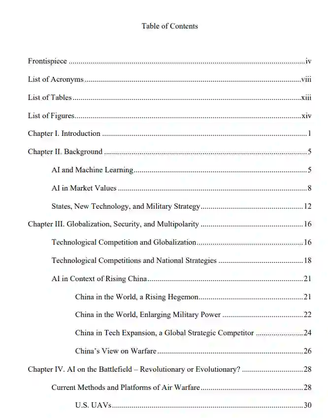 在国家间的竞争中,拥有技术优势的国家在历史上能够获得优势,尽管代价是破坏国际关系的稳定。这在历史上表现为火药、飞机、化学武器、英格玛机、雷达、核武器和卫星的发明。在冷战后和21世纪之交,常规威胁已经发展到新的技术领域。除了美国防部(DoD)公认的陆、海、空领域之外,还增加了两个新的层面:太空和网络空间。太空领域包括卫星和高超音速巡航导弹,以取代旧的弹道系统;网络领域,随着万物互联(IoE)的发明,保护国家免受黑客攻击、商业机密和知识产权(IP)的盗窃。随着网络和太空领域的发展,空中领域现在采用了遥控飞机(RPA)作为无形的智能体。此外,新出现的人工智能(AI)技术,以其显著的适应性,将把空域推向比RPA今天提供的更多的自主性。尽管人工智能的理论基础可以追溯到20世纪50年代(Anyoha,2020年),但直到公开展示机器在某一特定领域超越人类智力时,它才成为一个讨论的话题。