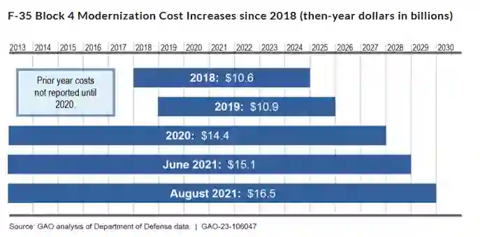 此外,美国防部正在进行为期5年的开发工作,以使F-35的能力现代化。这项努力,即所谓的Block 4,正经历着重要技术更新的开发延迟。第4块的成本也增加到165亿美元,自GAO上次报告以来增加了超过10亿美元。