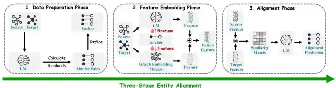 正如 图1 所示,实体对齐能显著增强LLM应对复杂查询的能力。当面对一个需要结合地理位置(首都)、文化(美食、地标)信息的查询时,若知识库是碎片化的,LLM将难以整合出完整答案。而经过实体对齐后,一个统一的知识库能提供所有必要信息,使LLM能够完美、准确地回应用户。为此,哈工大SCIR实验室知识计算组的陈则睿、范会明、王乾宇、何涛在刘铭教授与秦兵教授的指导下,共同撰写了这篇综述,该工作已被自然语言处理顶级会议EMNLP 2025录用为主会论文。本文创新性地提出了一个统一的技术框架,将整个LM驱动的实体对齐流程解构为三个逻辑清晰的核心阶段:数据准备、特征嵌入和对齐决策。通过这个框架,不仅对每个阶段的关键技术和代表性工作进行了细致剖析,还深入探讨了当前的核心挑战与未来发展路径。本文作者期望这篇综述能为初学者快速构建起对该领域的系统性认知,并为资深研究者提供富有洞见的参考与灵感。