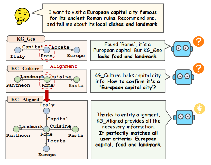 图1:实体对齐帮助大语言模型克服信息孤岛的例子
