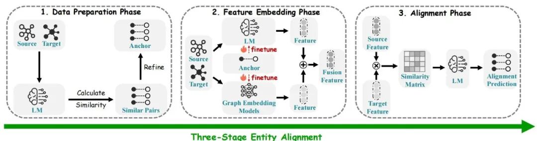 正如 图1 所示,实体对齐能显著增强LLM应对复杂查询的能力。当面对一个需要结合地理位置(首都)、文化(美食、地标)信息的查询时,若知识库是碎片化的,LLM将难以整合出完整答案。而经过实体对齐后,一个统一的知识库能提供所有必要信息,使LLM能够完美、准确地回应用户。为此,哈工大SCIR实验室知识计算组的陈则睿、范会明、王乾宇、何涛在刘铭教授与秦兵教授的指导下,共同撰写了这篇综述,该工作已被自然语言处理顶级会议EMNLP 2025录用为主会论文。本文创新性地提出了一个统一的技术框架,将整个LM驱动的实体对齐流程解构为三个逻辑清晰的核心阶段:数据准备、特征嵌入和对齐决策。通过这个框架,不仅对每个阶段的关键技术和代表性工作进行了细致剖析,还深入探讨了当前的核心挑战与未来发展路径。本文作者期望这篇综述能为初学者快速构建起对该领域的系统性认知,并为资深研究者提供富有洞见的参考与灵感。