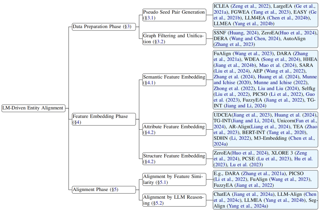 为系统化梳理现有工作,我们提出了一个分类法,将LM驱动的EA方法按其在流程中的核心作用,划分为三个关键阶段。数据准备阶段:关注LMs如何用于预处理、增强或筛选对齐所需的数据。具体包括伪种子对生成和图谱过滤与统一。特征嵌入阶段:阐述LMs如何为实体生成富含上下文的向量表示。这进一步细分为语义特征嵌入、属性特征嵌入和结构特征嵌入。对齐阶段:涵盖如何利用LM衍生的特征或其内在的推理能力来做出最终的匹配决策。这包括基于特征相似性的对齐和基于LLM推理的对齐。