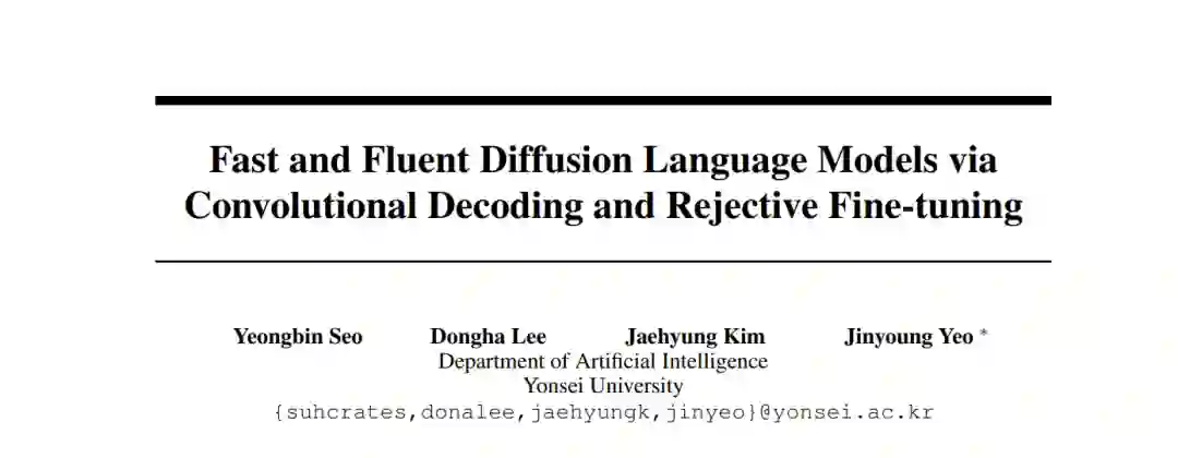 自回归(Autoregressive, AR)语言模型以逐 token 的方式生成文本,这限制了其推理速度。扩散式语言模型(Diffusion-based LMs)提供了一种有前景的替代方案,因为它们可以并行解码多个 token。然而,我们发现现有扩散语言模型存在一个关键瓶颈:长解码窗口问题,即生成位置远离输入上下文的 token 往往变得无关或重复。以往的解决方案(如半自回归方法)通过将窗口划分为块来缓解该问题,但这会牺牲速度与双向性,从而削弱扩散模型的主要优势。 为解决这一问题,我们提出了卷积解码(Convolutional decoding, Conv),这是一种基于归一化的方法,可在无需硬性分段的情况下缩小解码窗口,从而提升流畅性与灵活性。此外,我们引入了拒斥规则微调(Rejecting Rule-based Fine-Tuning, R2FT),这是一种后处理训练机制,能够更好地对齐远离上下文位置的 token。 在开放式生成基准(如 AlpacaEval)上的实验结果表明,我们的方法在扩散语言模型的基线中取得了最新最优性能,并显著减少了步长,相较于以往工作同时实现了速度与质量的提升。代码已在 GitHub 上公开。