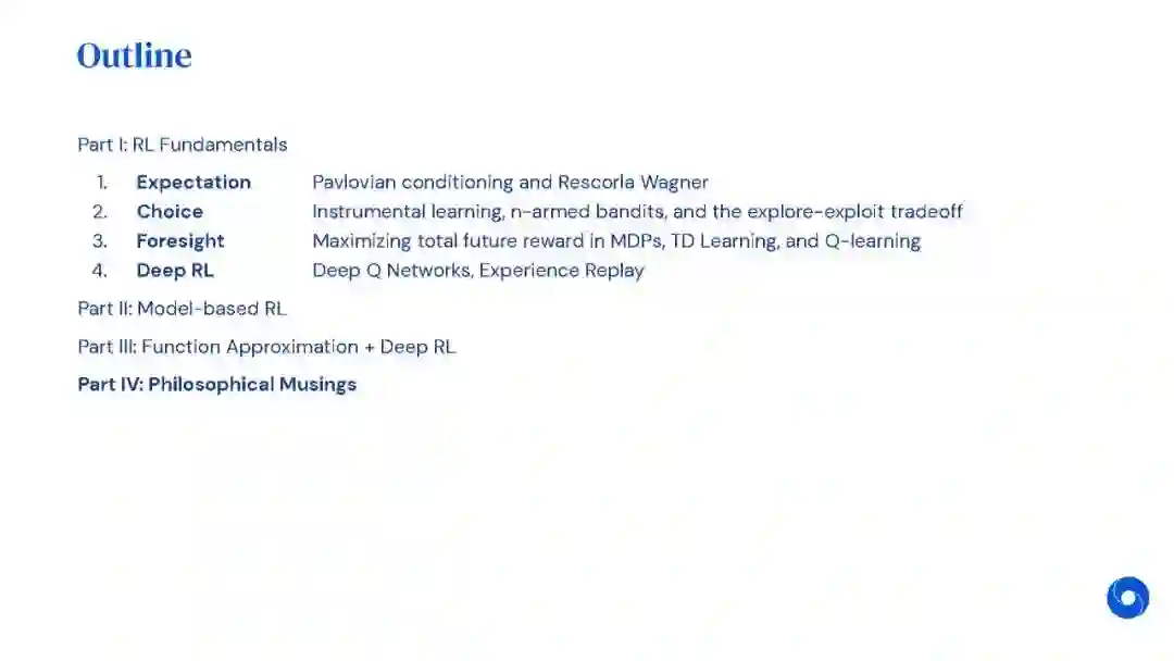 在本教程的第一部分中,我们将概述强化学习中的关键概念,涵盖神经科学和机器学习中的RL的历史。我们将从早期的奖励动机行为的基本模型开始,因为它们应用于动物和机器学习。我们将讨论这些模型如何通过与丰富的特征和结构化世界模型的接口变得更加丰富,以及这些方法如何应用于复杂行为的分析和神经计算。**最后,我们将讨论这些想法如何在深度RL中最先进的方法中体现出来。**在本教程的后半部分,我们将进行一个编码练习,对RL智能体进行编码,并提取激活值,以与神经活动进行比较。