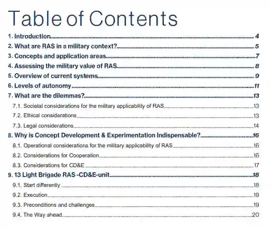 机器人和自主系统(RAS)是一个不断发展的军事产业。虽然军方对RAS的兴趣已经存在了几十年,但这种系统在实验和地面行动中的使用和应用是相对较新的,而且在不断增长。这也是荷兰武装部队的情况。2018年,荷兰皇家陆军建立了一个实验单元来探索RAS,即所谓的战争的第四次进化。与这个单元一起,荷兰陆军开始了实地实验和正在进行的研究,涵盖了关于RAS军事用途的广泛的基本主题。这篇文章是对这项研究的总结,进行了两年时间。本文简要讨论了军事应用、自主性的含义、伦理和法律方面的考虑,以及陆军内部需要采取不同的方法来跟上技术革新的步伐。随后,本文描述了荷兰武装部队安排其概念开发与实验(CD&E)计划的方式,以及鉴于快速创新的需要和大型组织内官僚主义的现实,它所遇到的摩擦。最后,本文对实地实验的第一批发现和结论进行了反思。