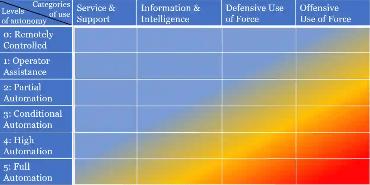 "杀手机器人 "的言论使公众对军事背景下的机器人和自主系统的看法变得狭隘,只认为是高度或完全自主的系统对武力的致命使用。实际上,RAS可以应用于许多军事功能和任务,每种功能都有不同程度的自主性(见图1)。机器人和自主系统的广泛军事适用性产生了许多巨大的机会。未来几年的挑战是如何充分利用这些机会,发挥军事优势的潜力,同时减轻所带来的风险。