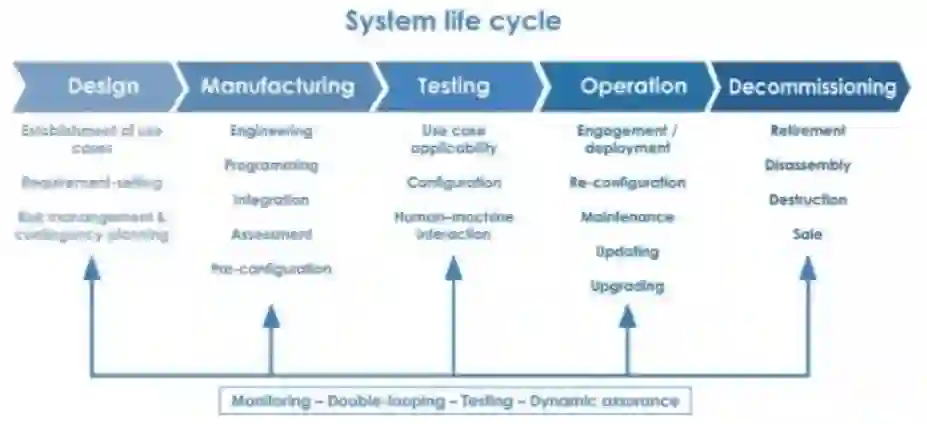生命周期。生命周期的概念包括系统的各个阶段,从设计到制造、测试、运行中的使用和退役。每个阶段的责任以及自动化系统的各个方面都有所不同。总而言之,在法律和道德范围内,自动化(军事和或双重用途)组件的生命周期得到良好管理的总体责任在于订购系统的国防组织。在这样做的时候,其采购规格应包含这些内容。各个(子)系统的生产商要对其部件的运作负责。