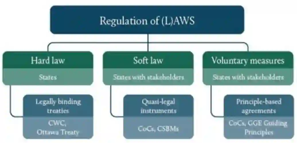 管理RAS的法律方法包括硬法律、软法律和自愿措施。硬法涉及国家间谈判和商定的具有约束力的条约。软法涉及准法律文书,如具有政治约束力的行为守则(CoCs)或建立信任和安全的措施(CSBMs),有时涉及国家以外的多个利益相关方。最后,自愿性文书包括行为原则或规范以及最佳做法的交流,或传统军备控制界内部或外部的其他信息(见图6)。